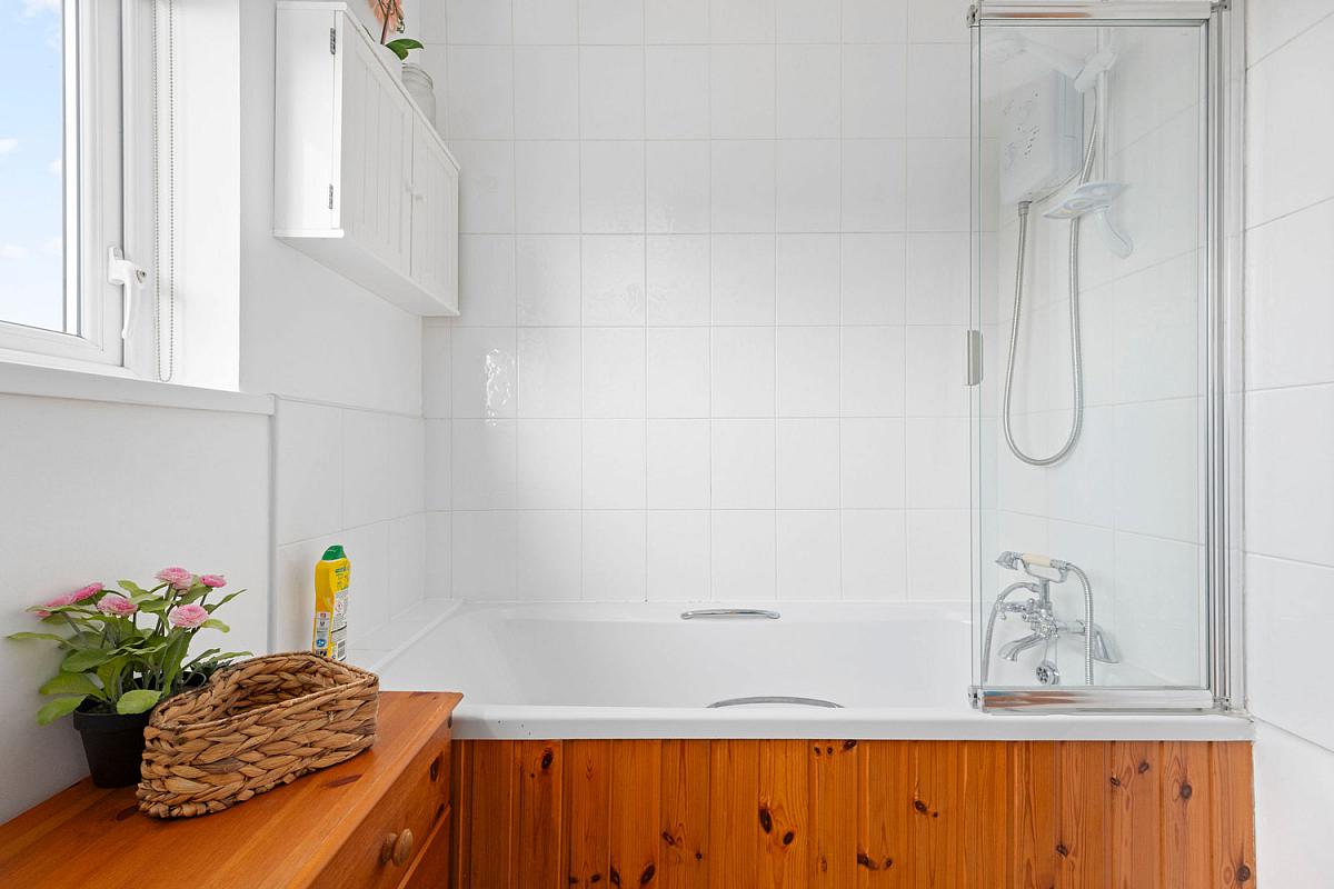 With white suite comprising w.c., wash hand basin with tiled splashback, electric shower over pine panelled bath, part tiled walls, shaver point and light and extractor fan.