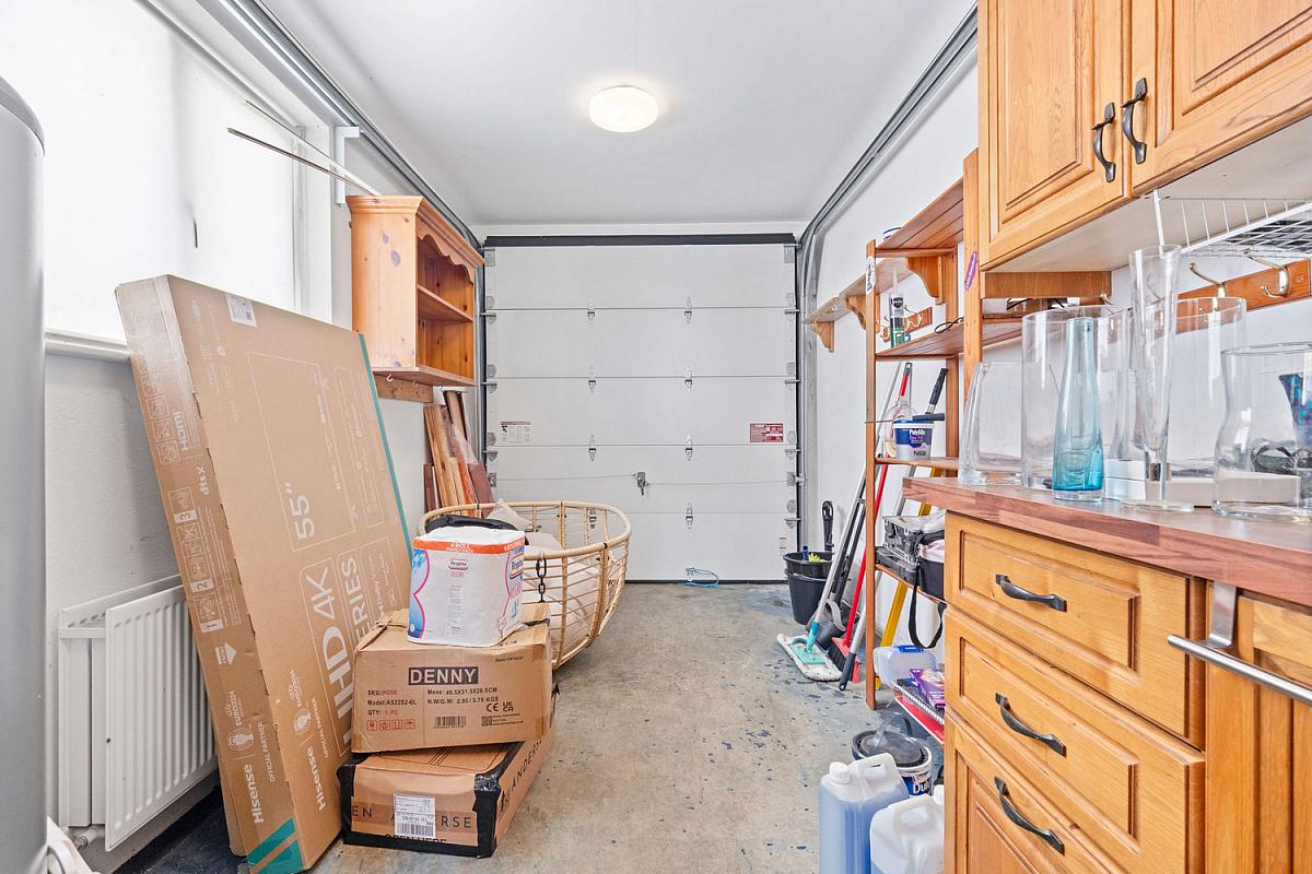 Tarmac driveway leading to integral garage 154 x 78 with up and over door, stainless steel sink unit, high and low level built in units with tiling between, shelving, boiler and light and power points. Garden to rear is laid in lawn and fenced in with elevated paved patio area. Shed to rear. Light to front and rear. Tap to rear. Garden to front is laid in lawn with trees and shrubbery.