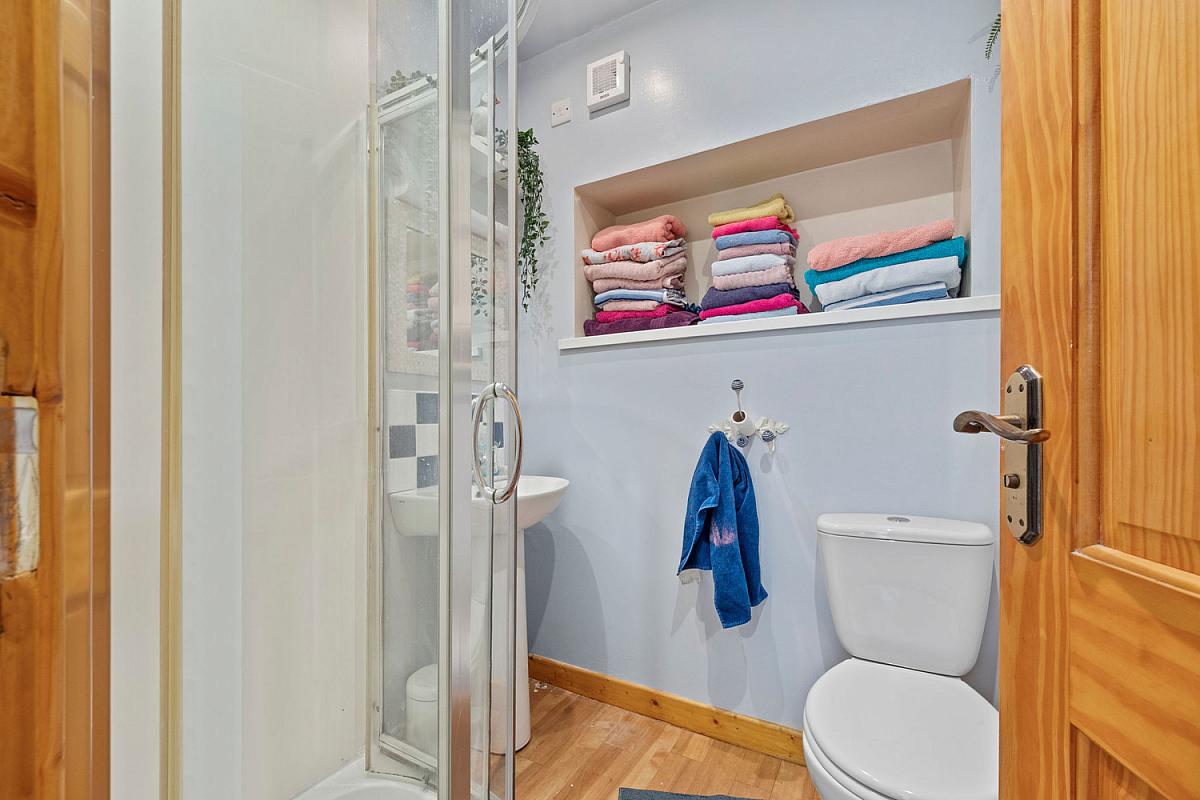 With white suite comprising w.c., wash hand basin with tiled splashback, PVC sheeted walk in shower cubicle with mains shower, shaver point and light, recessed shelving, extractor fan and laminate wood floor.