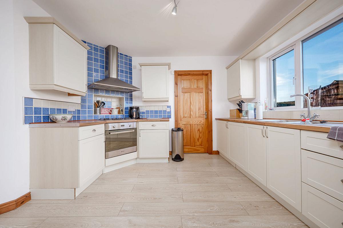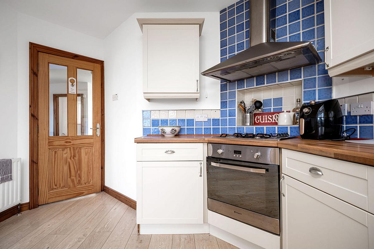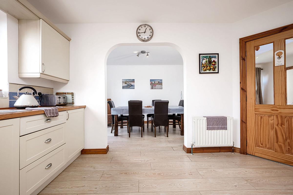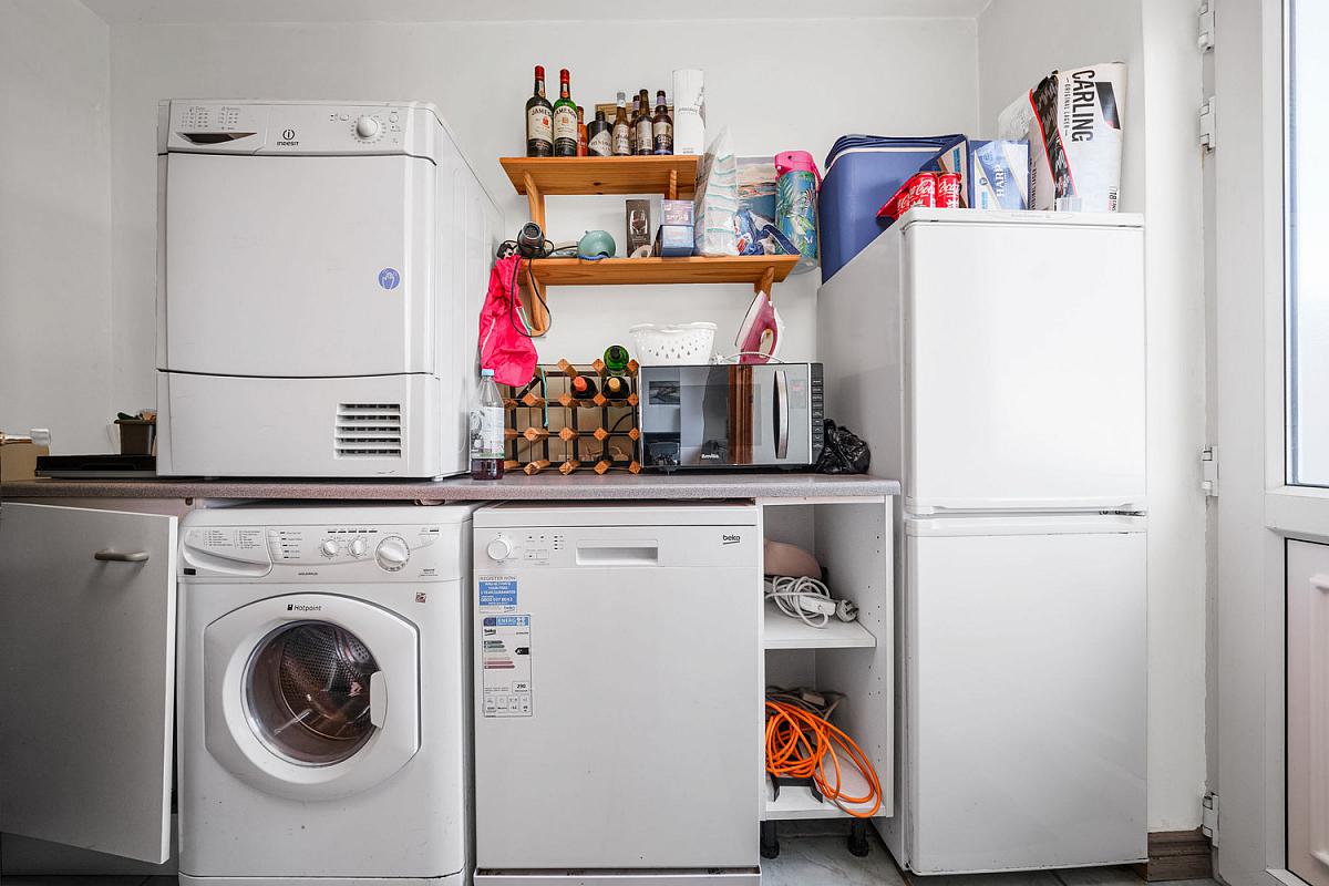 With plumbing for automatic washing machine, space for fridge freezer, boiler, tiled floor and pedestrian door to rear garden.