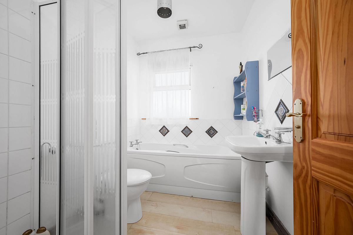 With white suite comprising w.c., wash hand basin with tiled splashback, fully tiled walk in shower cubicle with electric shower, tiled round bath, extractor fan and laminate wood floor.