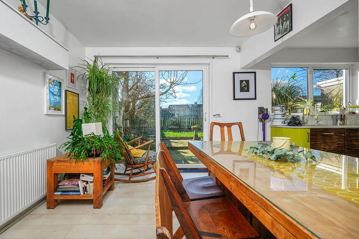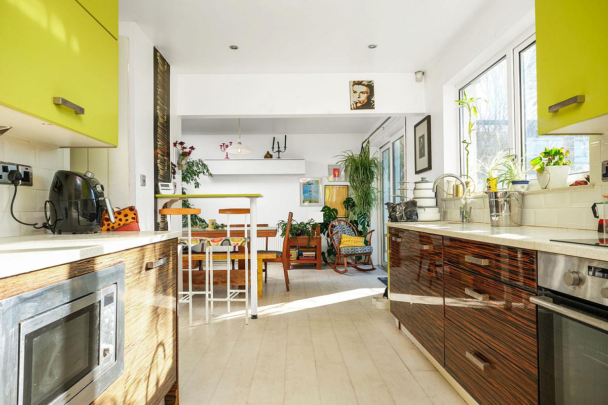 With undermount stainless steel sink unit set in granite worktop, high and low level built in units with tiling between, full wall built in units, integrated ceramic hob, integrated oven and extractor fan above, integrated dishwasher, integrated microwave, integrated fridge freezer, saucepan drawers, breakfast bar with seating below, under unit lighting, saucepan drawers, recessed lighting, laminate wood floor and PVC sliding patio doors leading to rear garden.