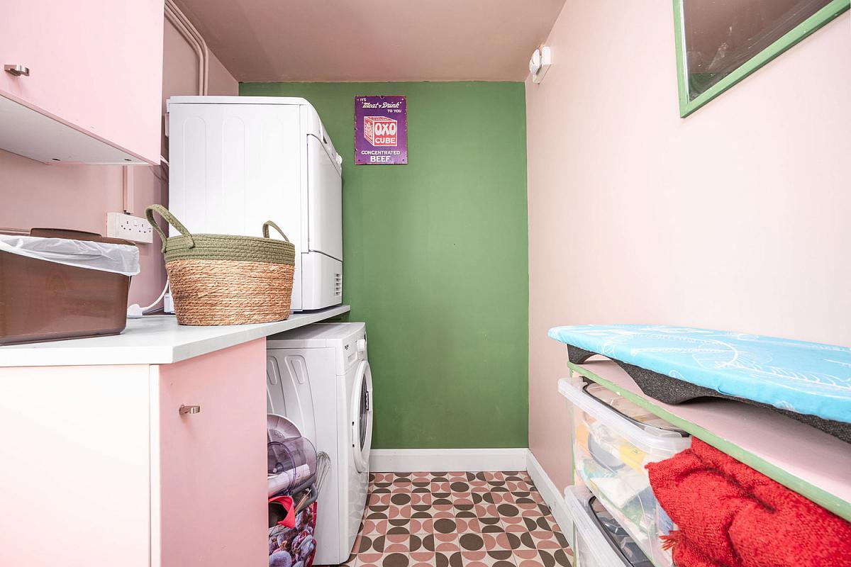 With high and low level built in units, plumbed for automatic washing machine, space for tumble dryer and door leading into garage.