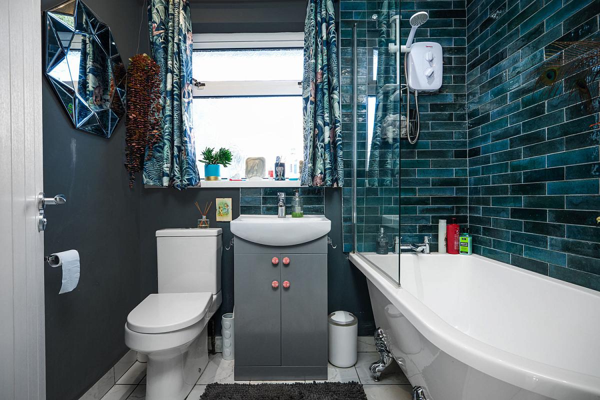 With white suite comprising w.c., wash hand basin with storage below and tiled splashback, foot claw free standing bath with electric shower over, heated towel rail, part tiled walls, recessed lighting, extractor fan and tiled floor.