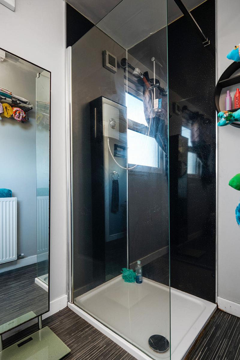 off with w.c., wash hand basin with tiled surround, PVC cladded walk in shower cubicle with electric shower, recessed lighting and extractor fan.