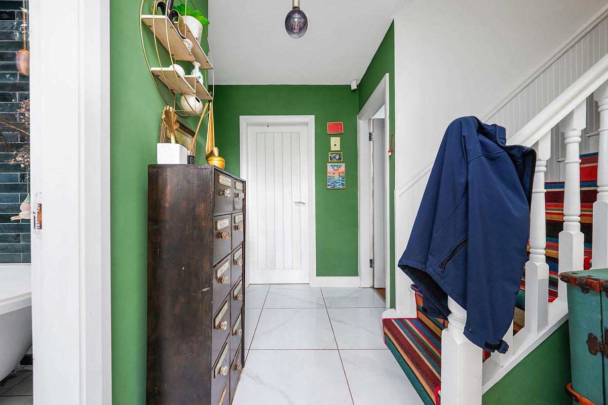 311 wide with cloaks cupboard housing gas boiler, access to roof space and tiled floor.