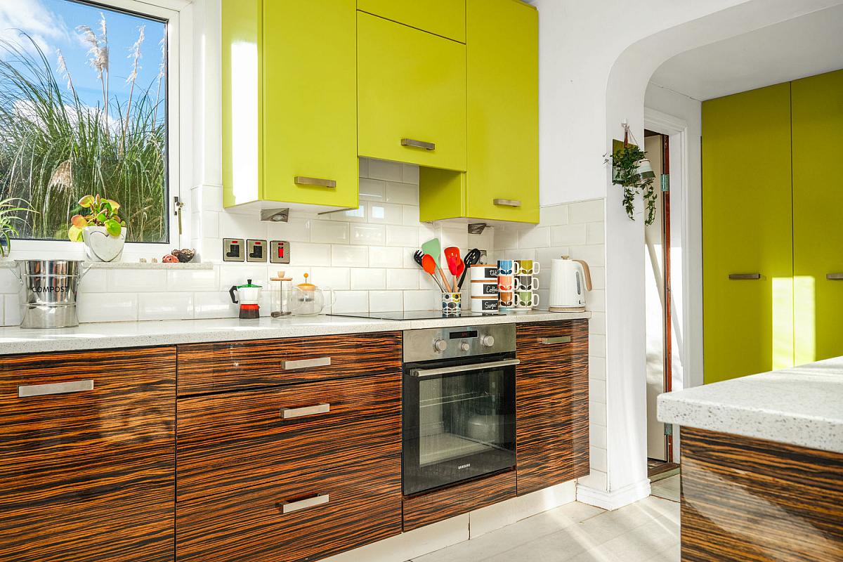 With additional matching large units consisting of two shelved broom cupboards, pull out larder, recessed lighting and laminate wood floor.