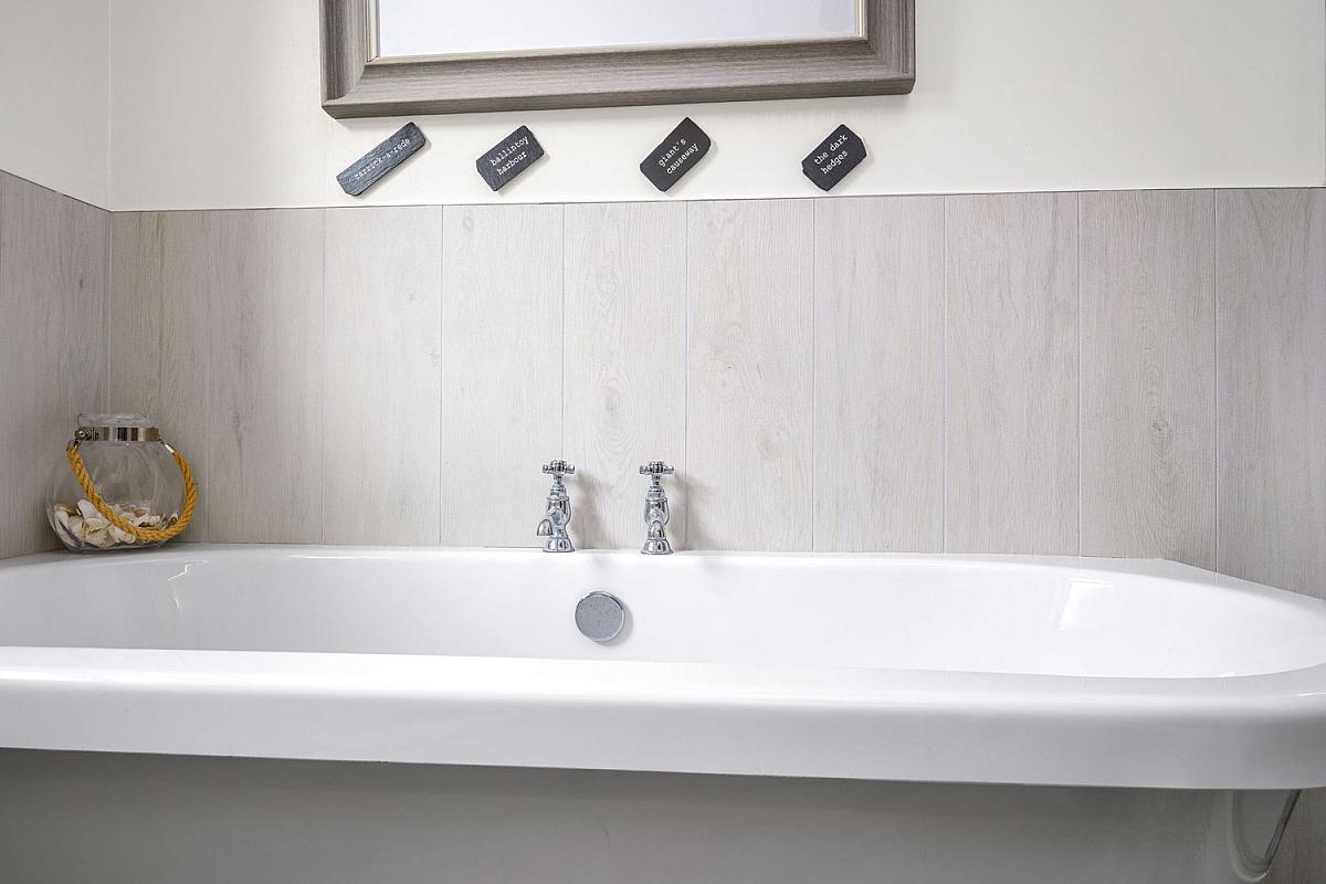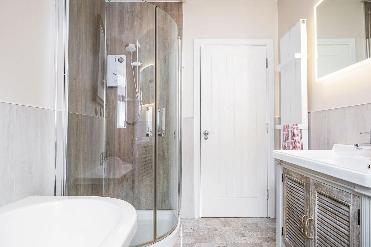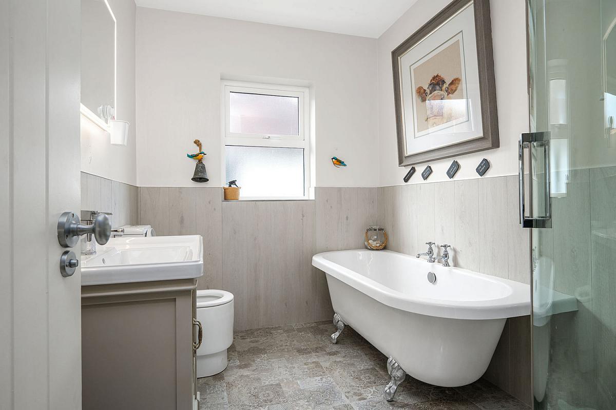 With white suite comprising w.c., wash hand basin, PVC cladded walk in shower cubicle with electric shower, claw foot bath, half tiled walls, heated towel rail, extractor fan and tiled floor.