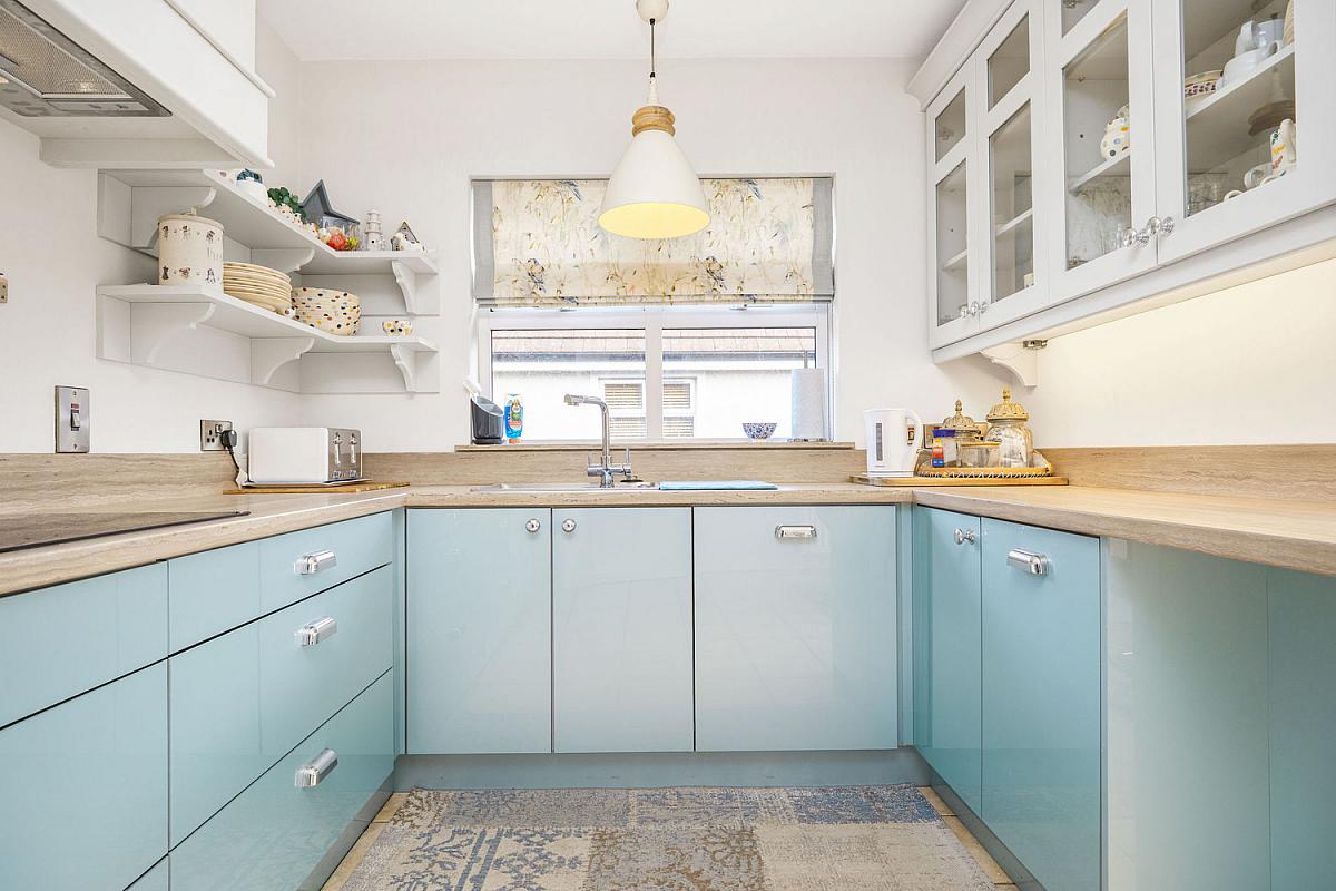 With stainless steel sink unit, high and low level built in units with under unit lighting, integrated fridge freezer, Bosch eye level oven, ceramic hob, wood canopy style extractor fan above, integrated dishwasher, glass display cabinets, shelving, saucepan drawers, larder cupboard, recessed lighting, tiled floor and PVC French doors to rear garden. 16'0 x 14'6