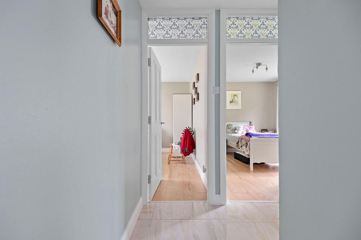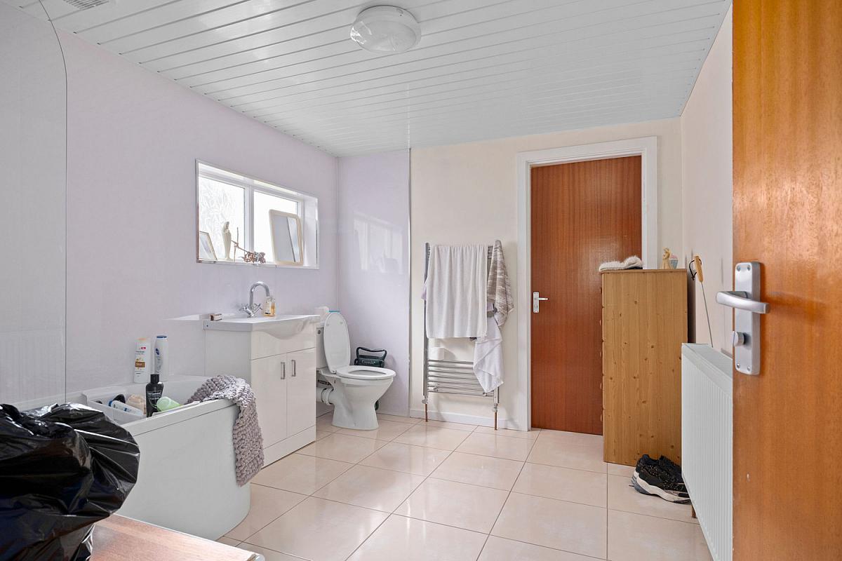 With white suite comprising w.c., wash hand basin, mains rainfall shower head with additional telephone hand shower over bath, heated towel rail, part PVC sheeted walls, extractor fan, tiled floor and PVC sheeting ceiling. Door into storage area.