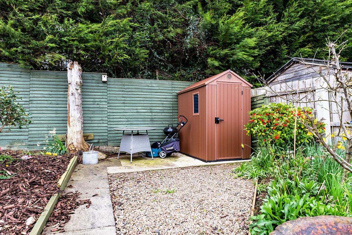 Tarmac driveway leading to storage area with roller door and lights. Garden to rear is laid in lawn and fenced in with concrete patio area with selection of trees and shrubbery with path surrounding the property. Boiler house, shed and two taps to rear. Light to front and rear. Garden to front is laid in lawn with a selection of shrubbery, plants and trees.