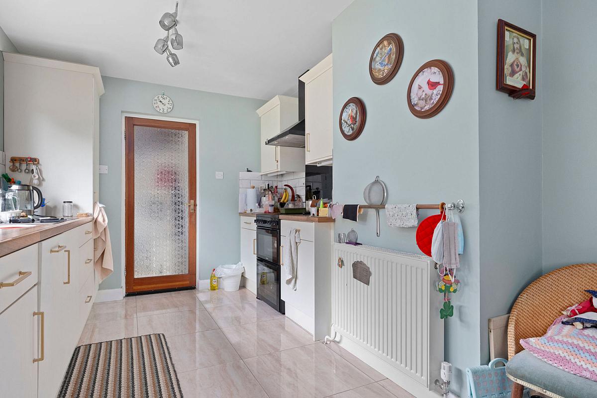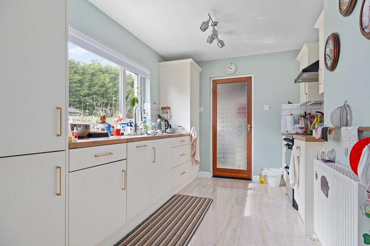 With single drainer stainless steel sink unit, high and low level built in units with tiling between, space for cooker with extractor fan, integrated fridge freezer, integrated dishwasher and tiled floor.