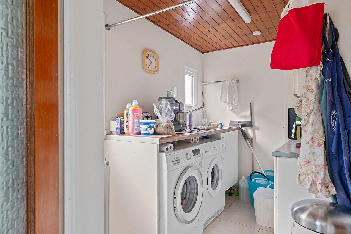 With single drainer stainless steel sink unit, high and low level built in units, plumbed for automatic washing machine, space for tumble dryer, wood sheeted ceiling with strip lighting.