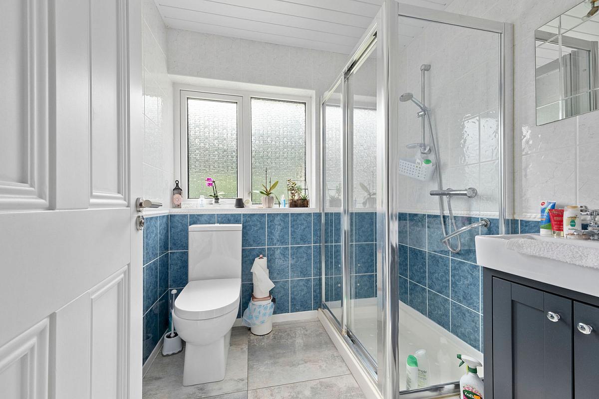 With white suite comprising w.c., wash hand basin with storage below, fully tiled walk in shower cubicle with mains shower, fully tiled walls, PVC sheeted ceiling and tiled floor.