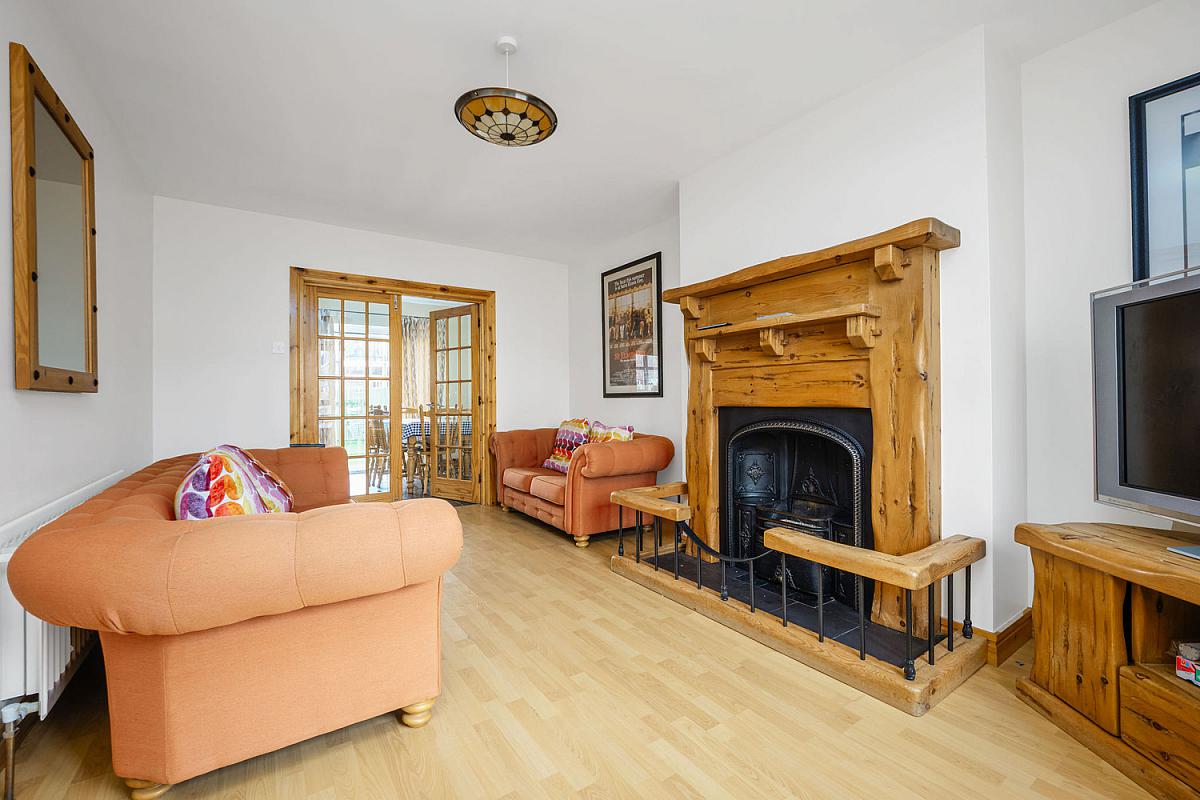 With pine surround fireplace with cast iron inset, tiled hearth and laminate wood floor.