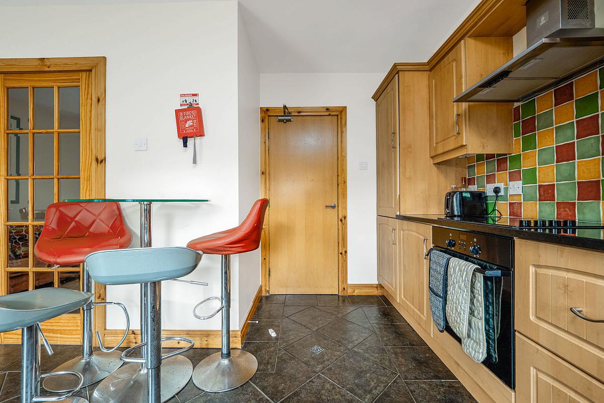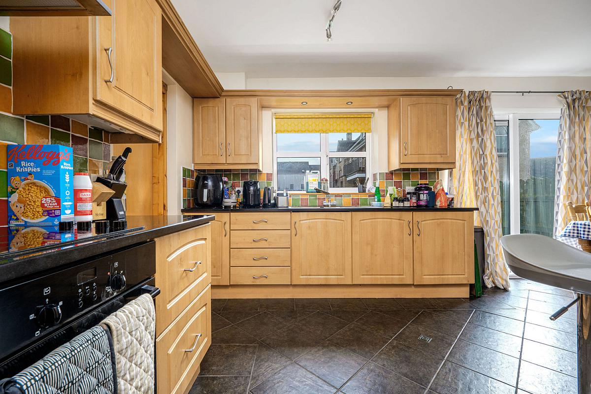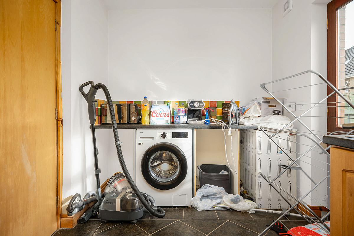With single drainer stainless steel sink unit, low level units with tiling above, plumbed for automatic washing machine, space for tumble dryer, boiler, extractor fan and tiled floor.