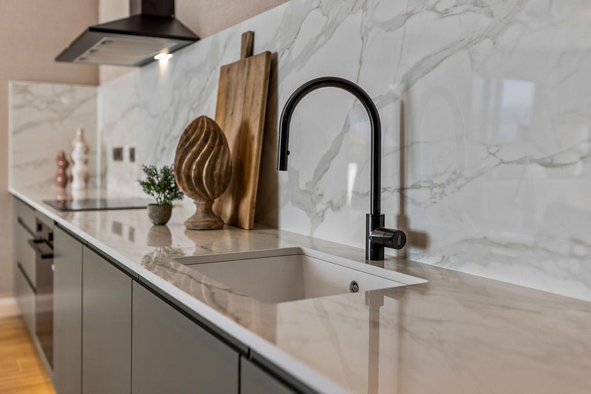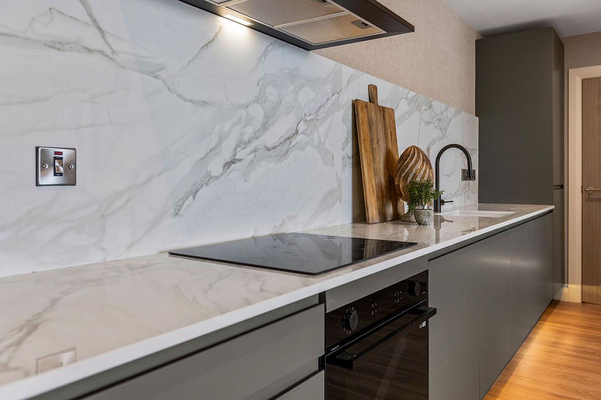 With 'Shock' sink unit set in Silestone worktops and splashbacks, low level units, feature strip under unit lighting, integrated fridge freezer, integrated oven, ceramic hob and matt black extractor fan above, integrated dishwasher, recessed lighting, tiled floor and sliding patio doors leading to composite balcony with panoramic views across Atlantic Ocean, Crescent, Dominican Covent, Portstewart Promenade and Harbour.