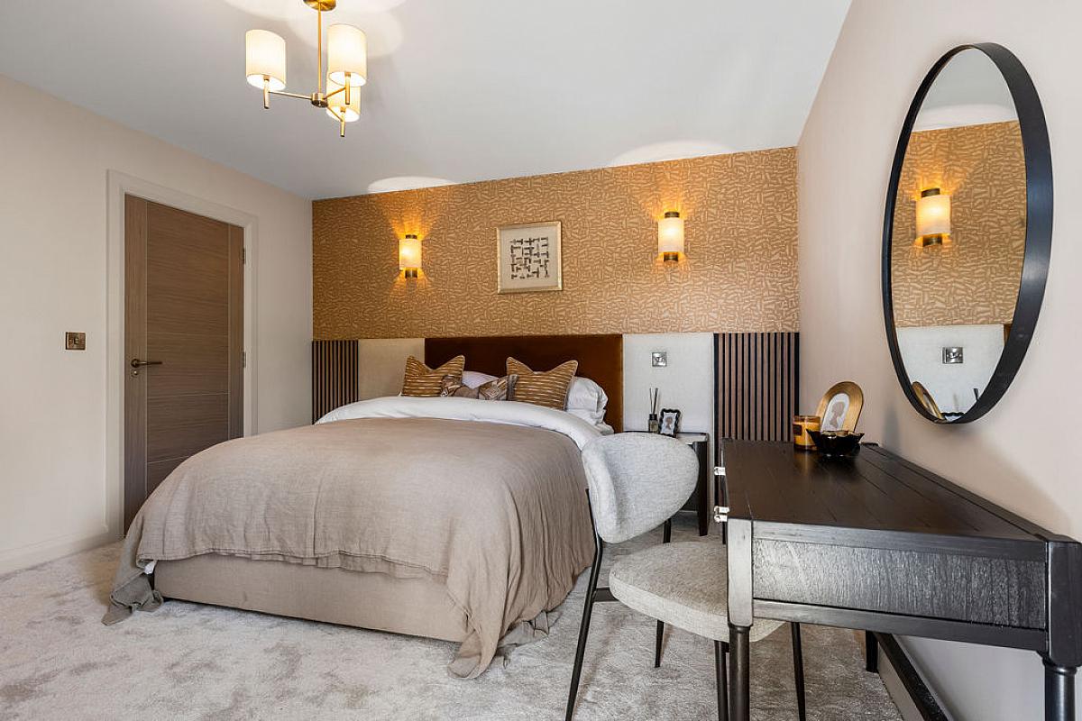 Ensuite off with w.c., wash hand basin set in vanity unit with storage below, fully tiled walk in shower cubicle with mains brass rainfall shower, additional telephone hand shower, extractor fan, recessed lighting and tiled floor.