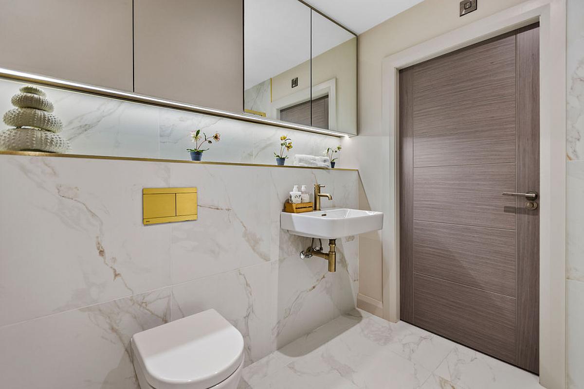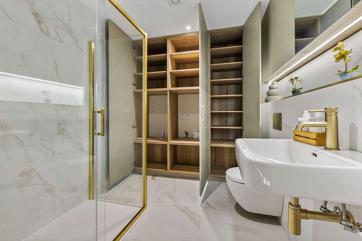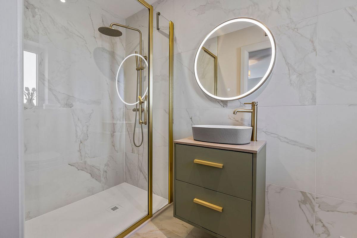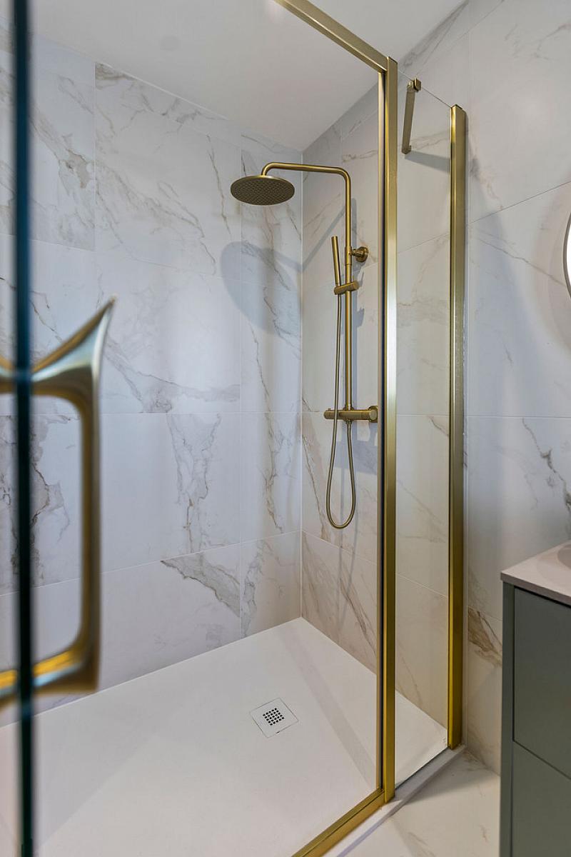 With w.c., wash hand basin, fully tiled walk in shower cubicle with mains shower with brass rainfall shower and additional brass telephone hand shower, part tiled walls, extractor fan, recessed lighting and tiled floor.