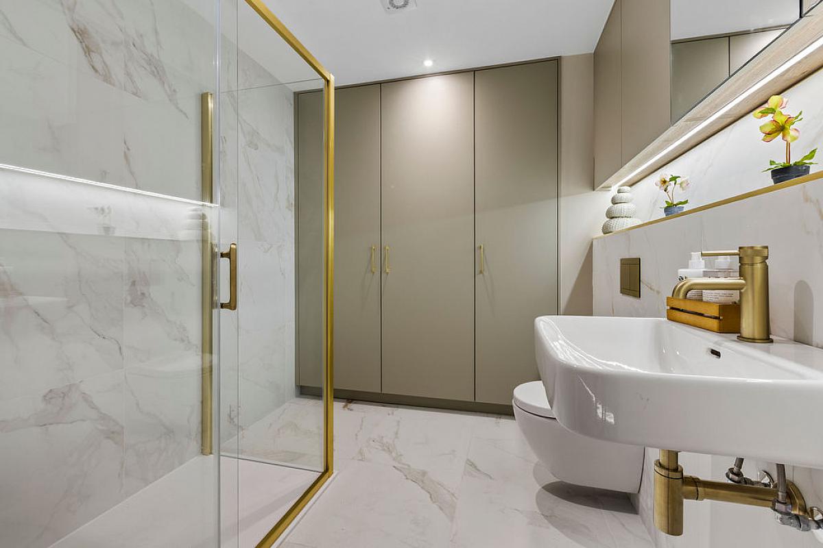 With storage cupboard, recessed lighting, LED lighting in skirting, thermostat controls and tiled floor.