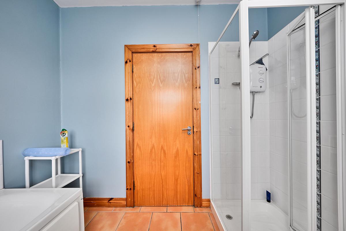 With white suite comprising W.C., fully tiled walk in shower cubicle with electric shower, wash hand basin, tiled round bath, extractor fan and tiled floor.
