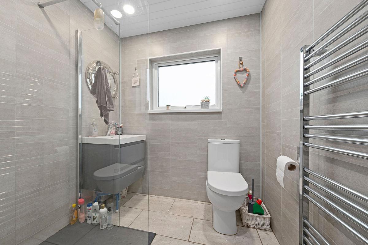 With white suite comprising w.c., floating wash hand basin with storage below, fully PVC cladded walk in shower cubicle with electric shower, heated towel rail, PVC cladded walls, recessed lighting in PVC sheeted ceiling, extractor fan and tiled floor.