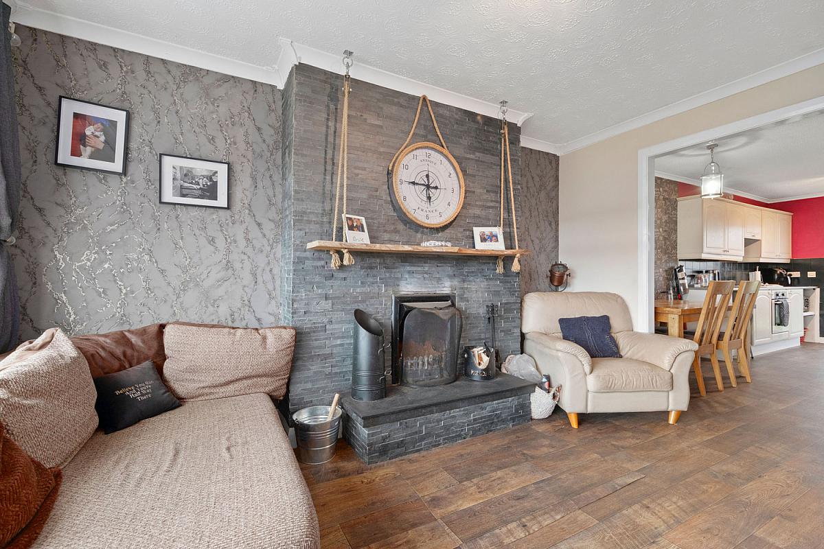 With raised hearth with slate fireplace, feature slate wall and coving. 1310 x 1110