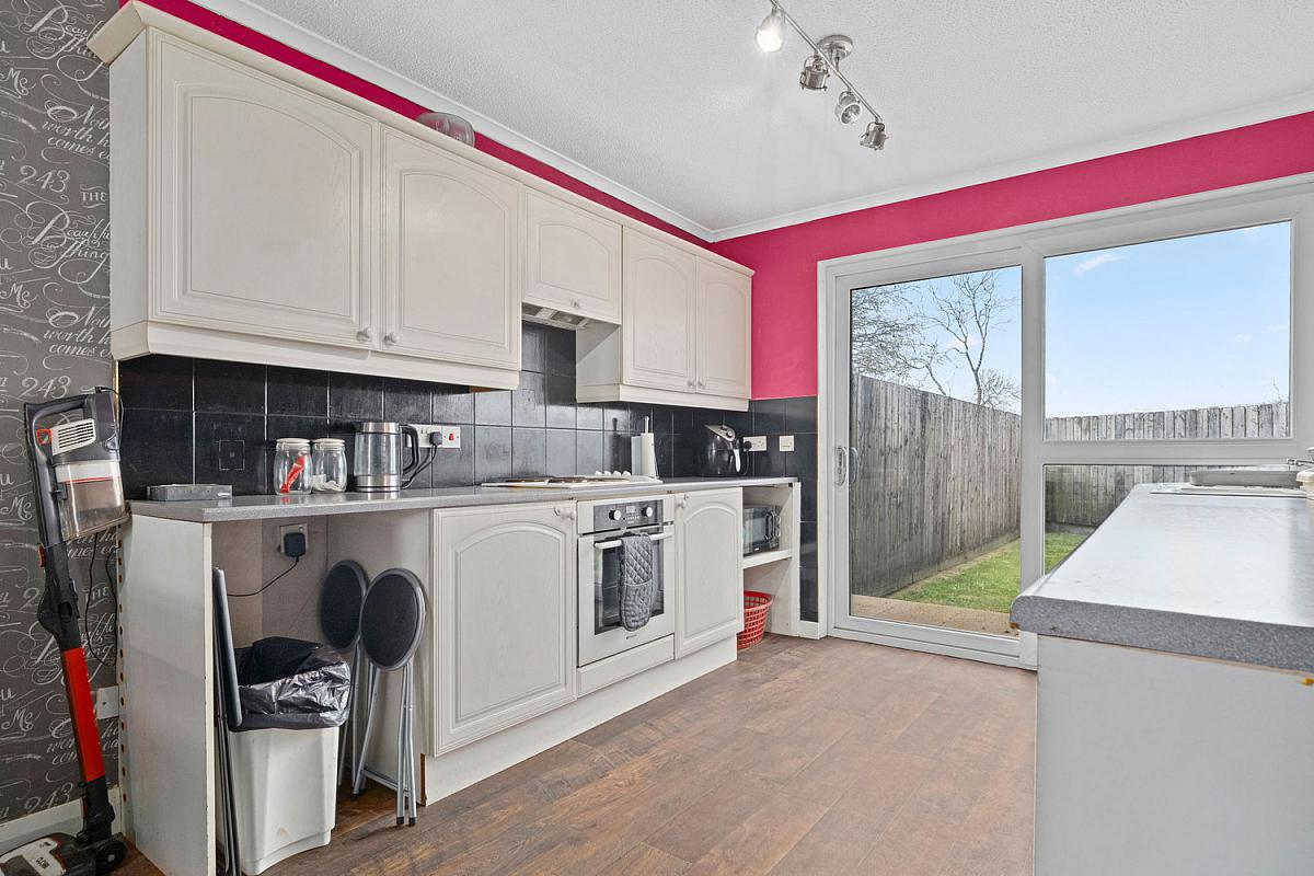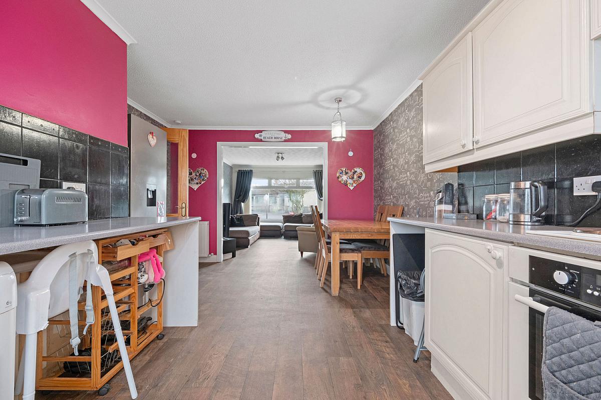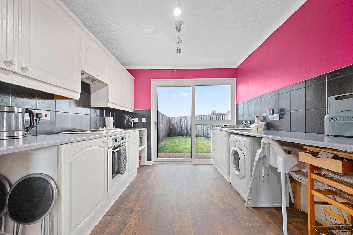 With stainless steel sink unit, high and low level built in units with tiling between, space for fridge freezer, plumbed for automatic dishwasher, plumbed for automatic washing machine, space for tumble dryer and sliding PVC patio doors leading to rear garden. 179 x 1110