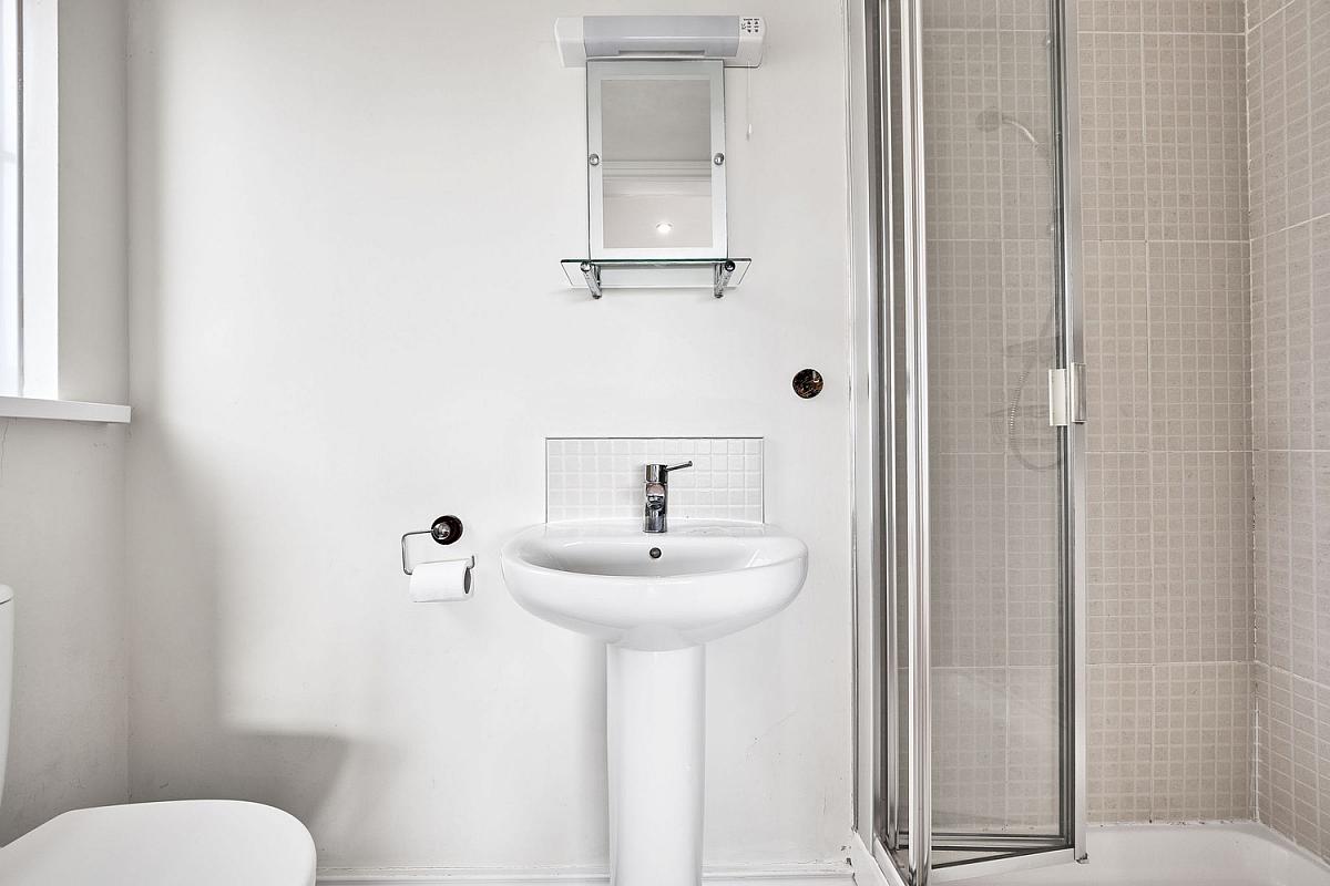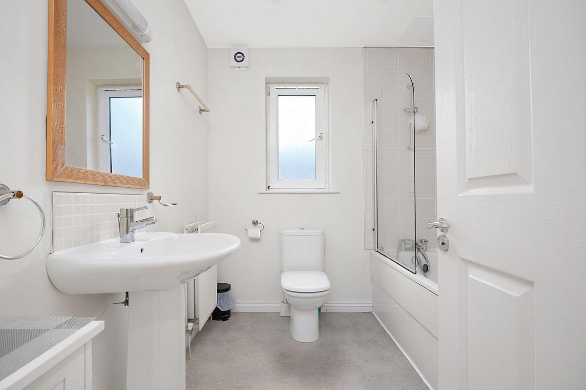 With white suite comprising w.c., wash hand basin with tiled splashback, telephone hand shower over bath with tiled surround, shaver point and light, recessed lighting and extractor fan.