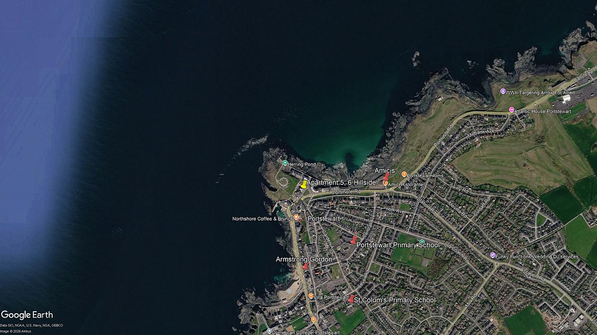 Proceed to the end of Portstewart Promenade past the harbour and follow the road as it turns right onto Harbour Road. Take the first left onto Victoria Terrace and then left again onto Hillside. Hillside House will be on your right hand side and No 5 will be the 1st floor rear apartment.