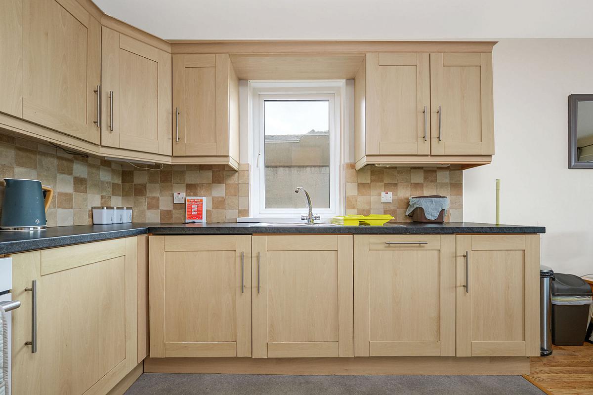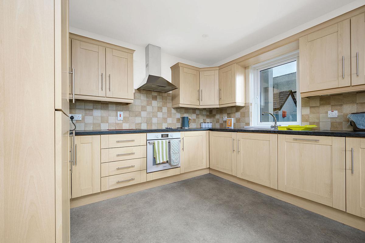 With bowl and half single drainer stainless steel sink unit, high and low level built in units with tiling between, integrated ceramic hob, integrated oven and fridge freezer, stainless steel extractor fan above, integrated dishwasher, integrated washing machine, wine rack and recessed lighting.