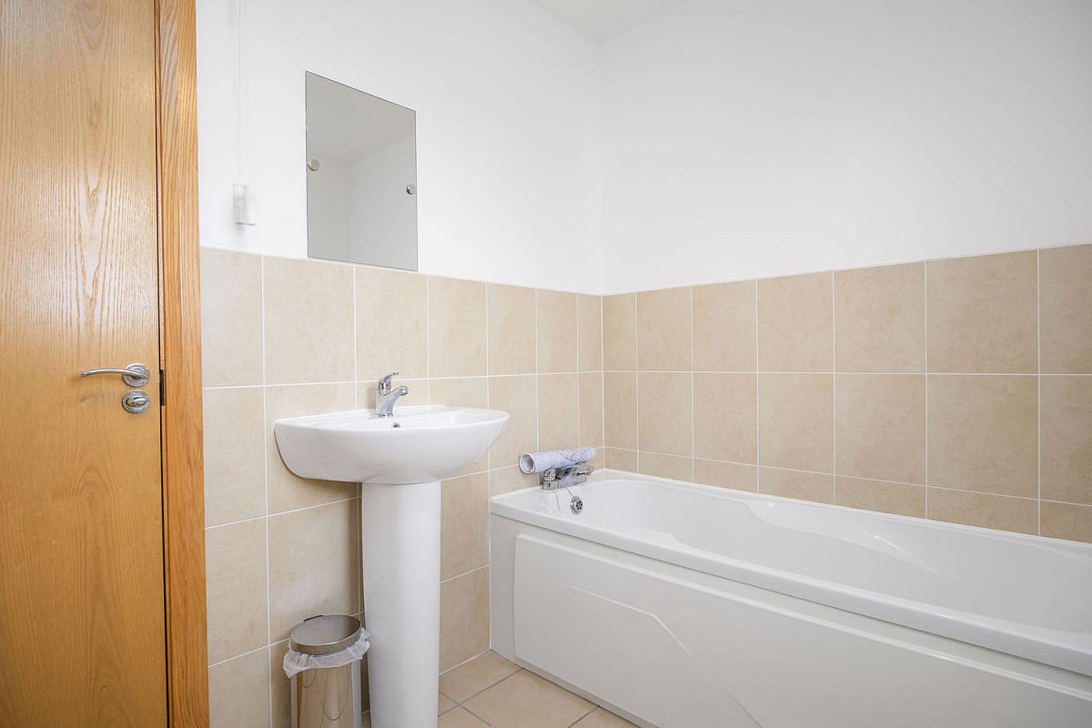 With white suite comprising w.c., wash hand basin, fully tiled walk in shower cubicle with electric shower, bath with tiled surround, half tiled walls, heated towel rail, extractor fan and tiled floor.