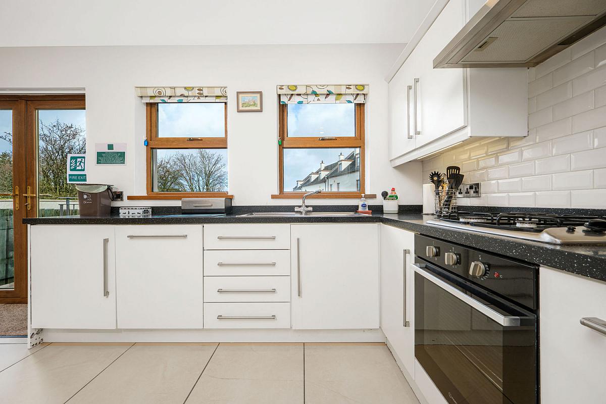 With single drainer stainless steel sink unit, high and low level built in units with under unit lighting, integrated gas hob, Indesit oven and stainless steel extractor fan above, integrated fridge freezer and dishwasher, integrated washer dryer, drawer bank, saucepan drawer, recessed lighting, free standing condenser dyer, tiled floor and French doors leading to rear garden.
