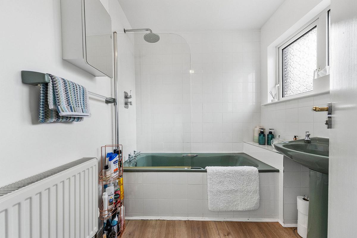 With coloured suite comprising w.c., wash hand basin, tiled surround bath with rainfall shower head and part tiled walls.