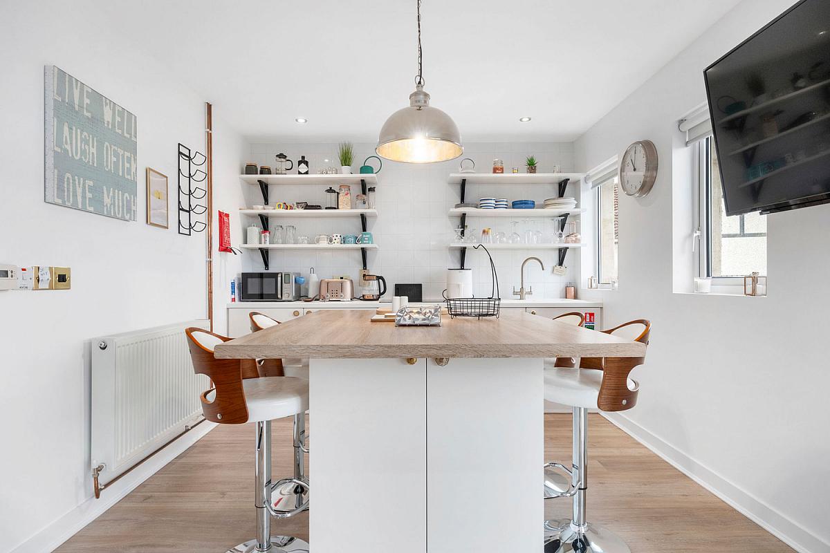 With single drainer sink unit, low level built in units with shelving and tiling above, integrated oven with hob above, Island unit with storage below and seating for four people, drawer bank, recessed lighting and laminate wood floor.