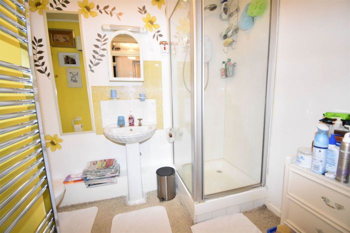 With w.c., wash hand basin, fully cladded walk in shower cubicle, chrome towel rail and extractor fan.