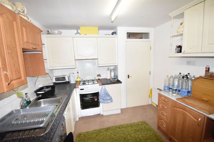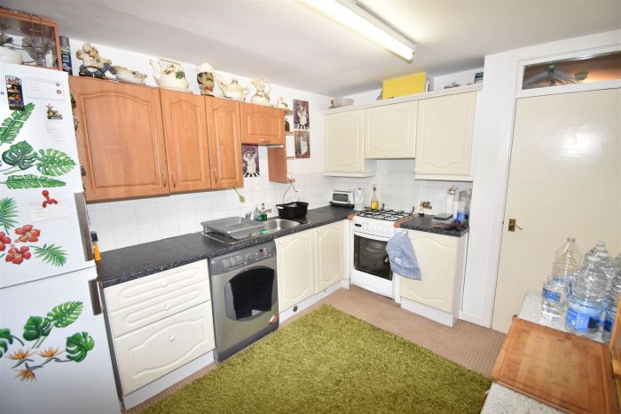 With stainless steel sink unit, high and low level built in units with tiling between, space for gas cooker and plumbed for automatic washing machine.