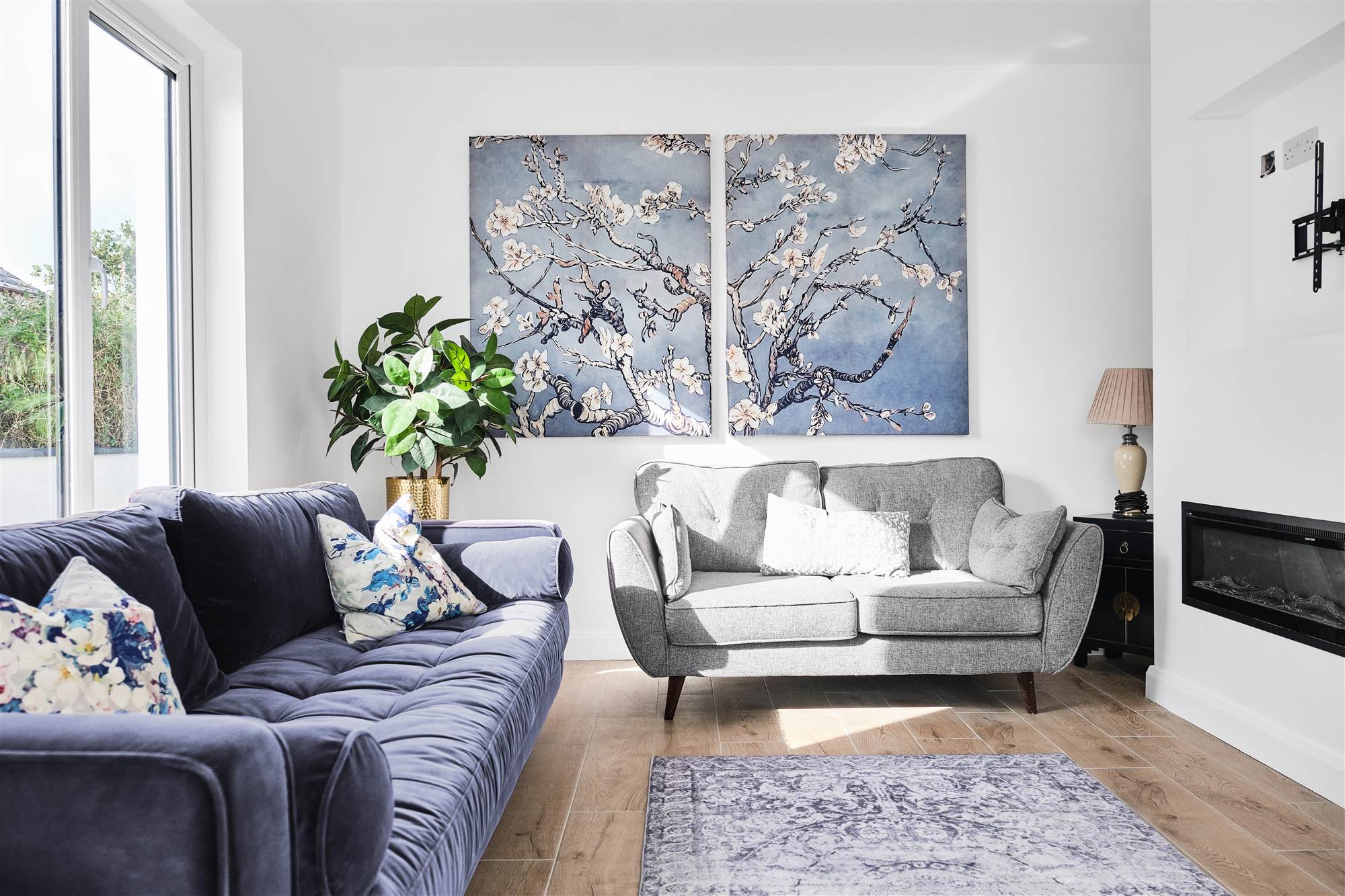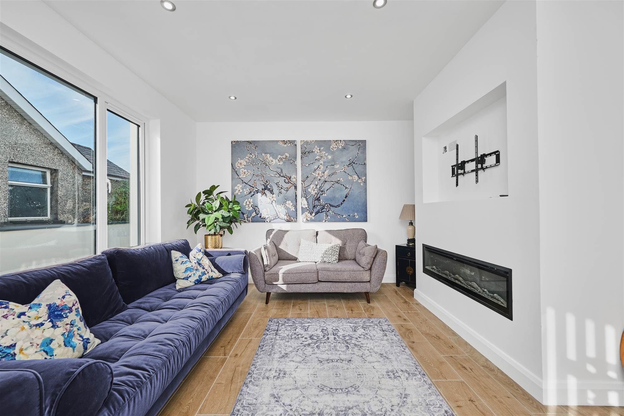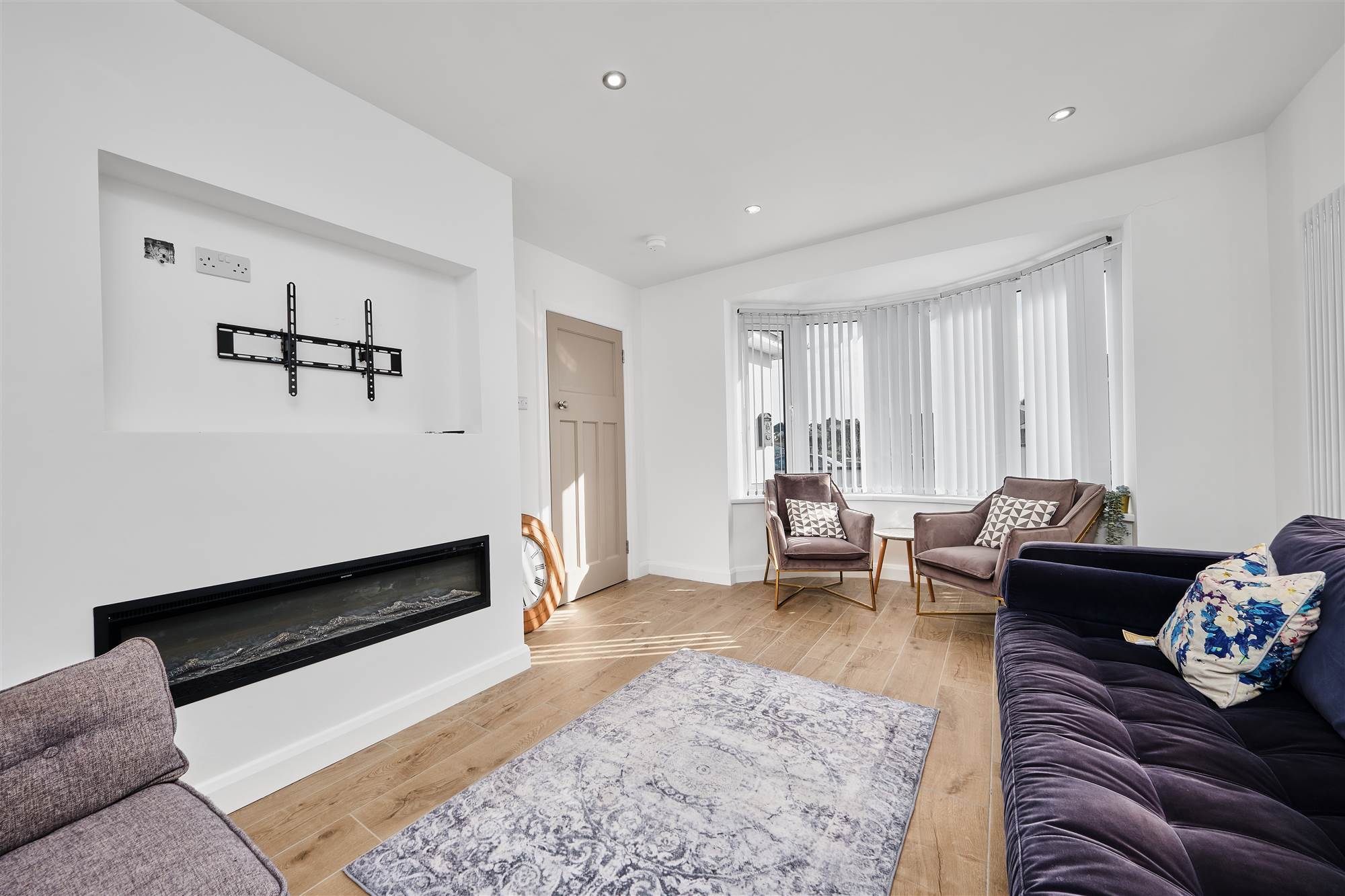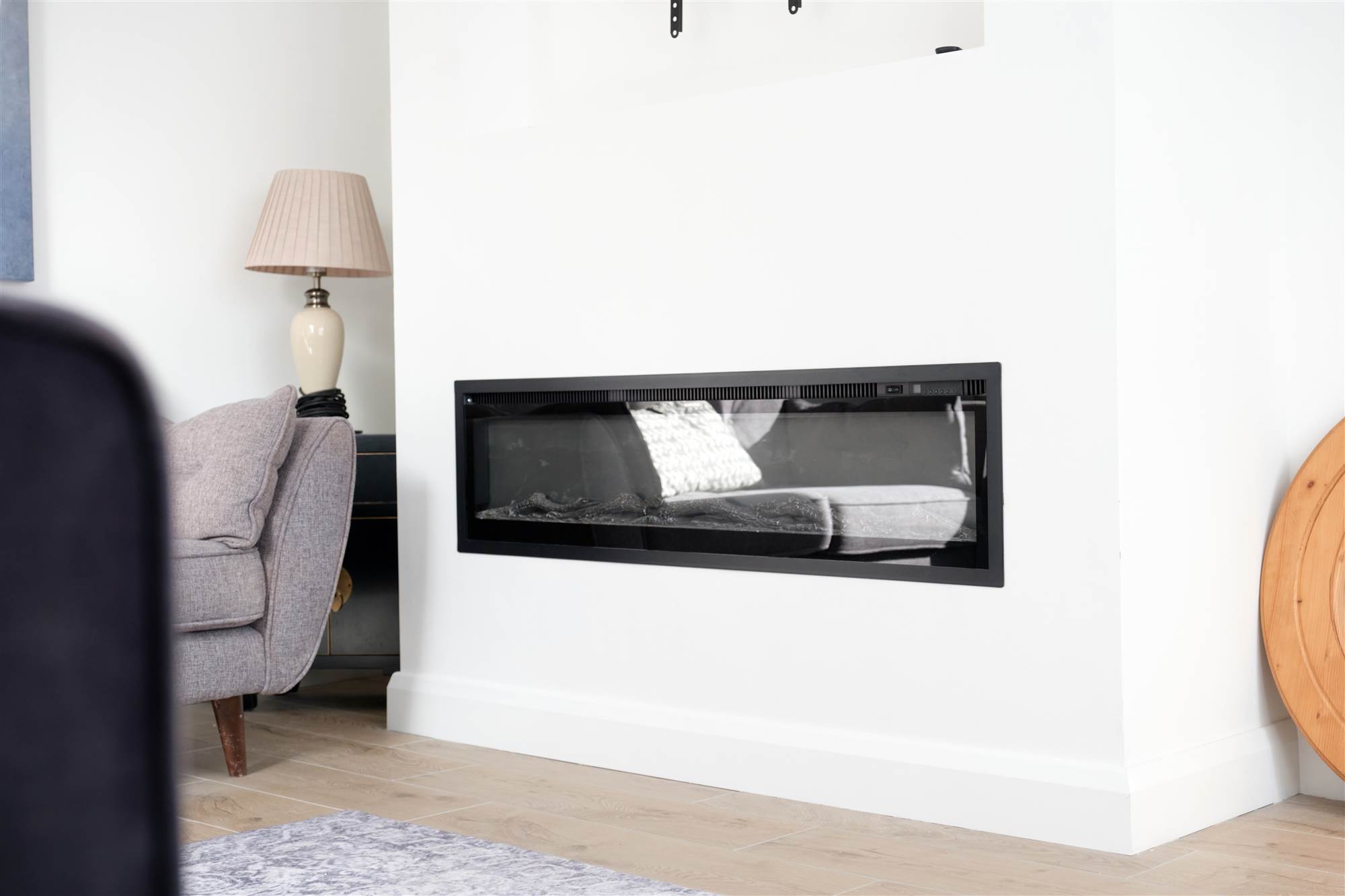 With recessed electric fire, recessed for T.V, recessed lighting and tiled floor. (into bay)