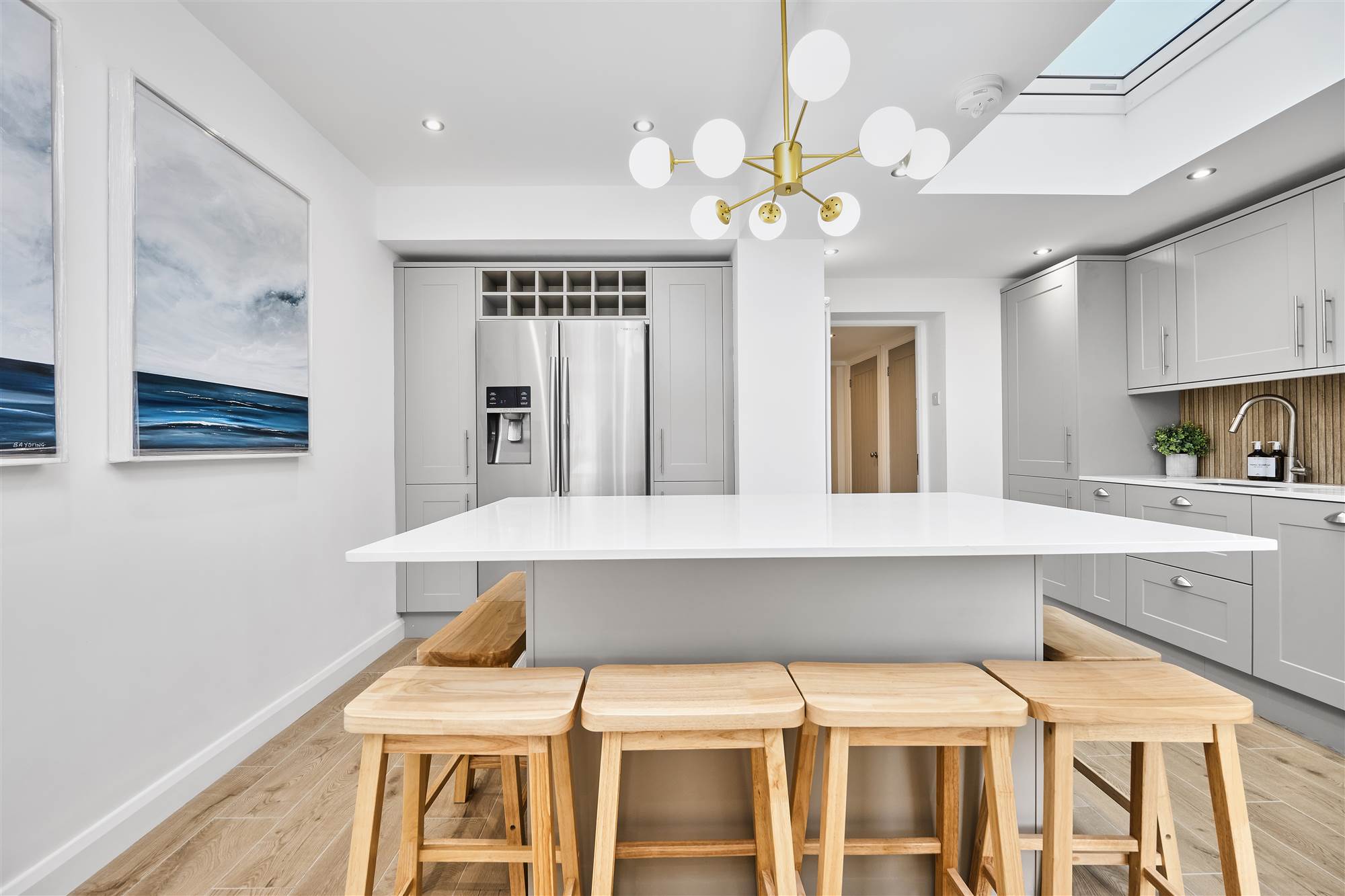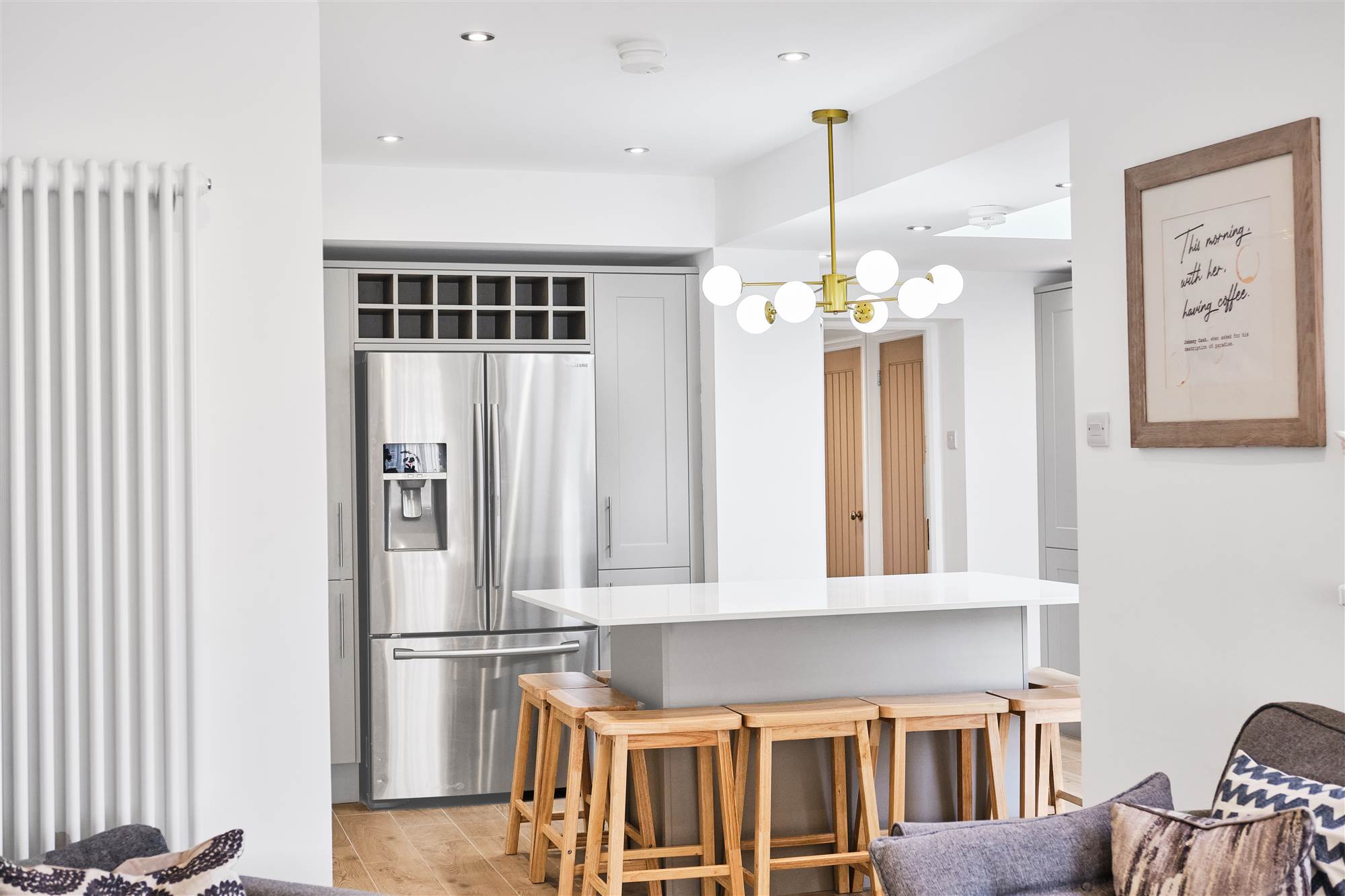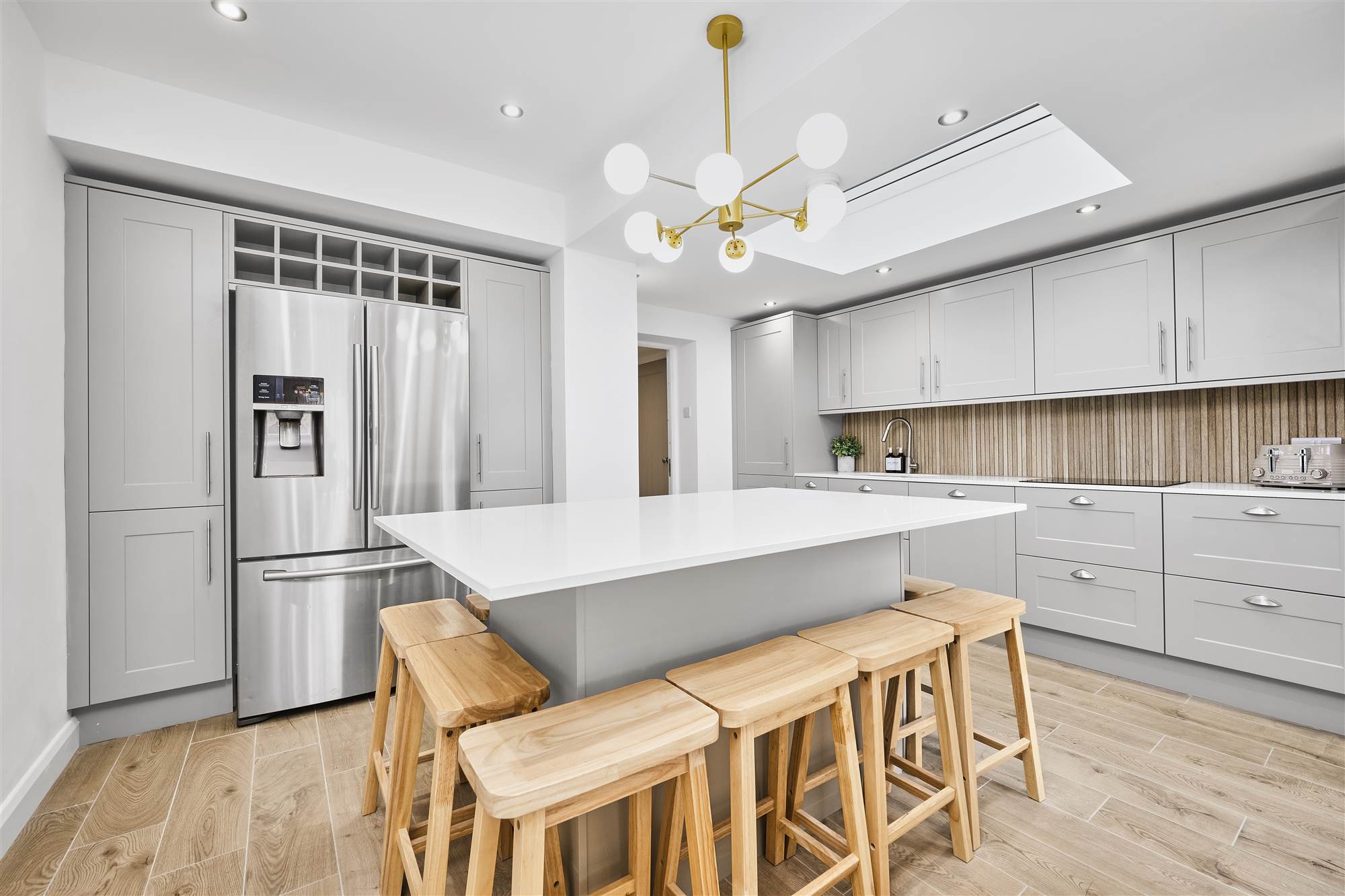 With bowl and half stainless steel sink unit set in granite worktops, high and low level units with wood effect tiling between, integrated ceramic hob, extractor fan above, double eye level oven, microwave, plumbed for American style fridge freezer, larder cupboards, saucepan drawers with rack, matching granite island with seating for multiple diners, recessed lighting, skylight and tiled floor.