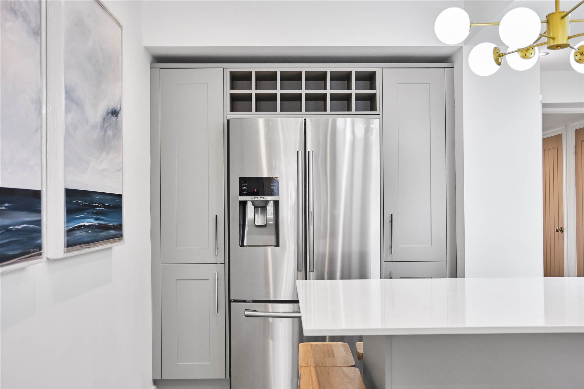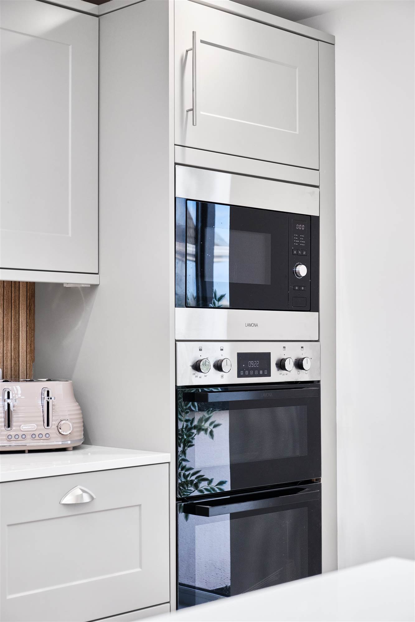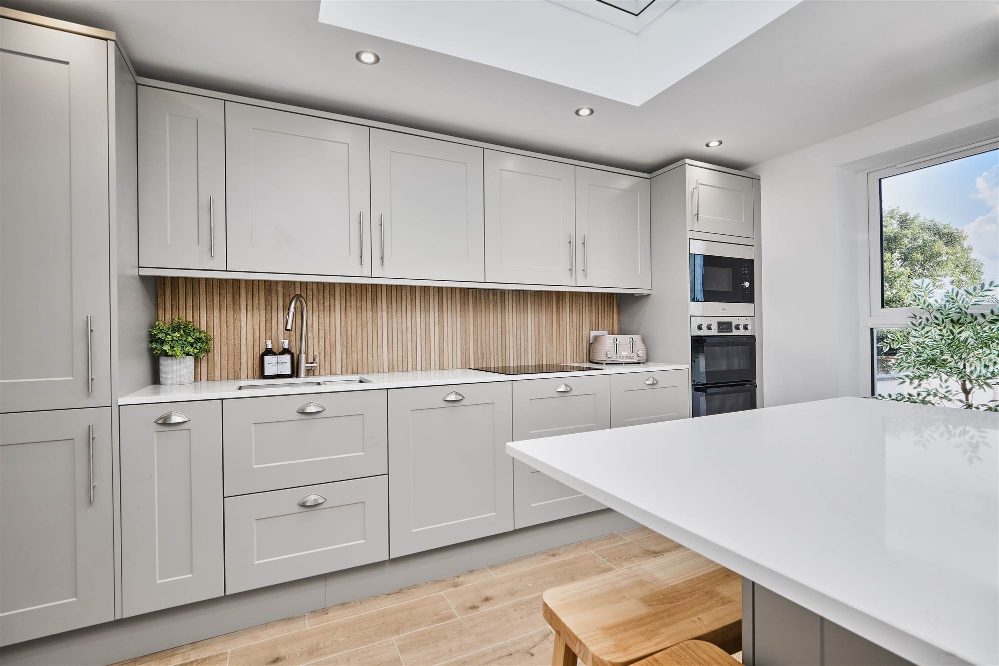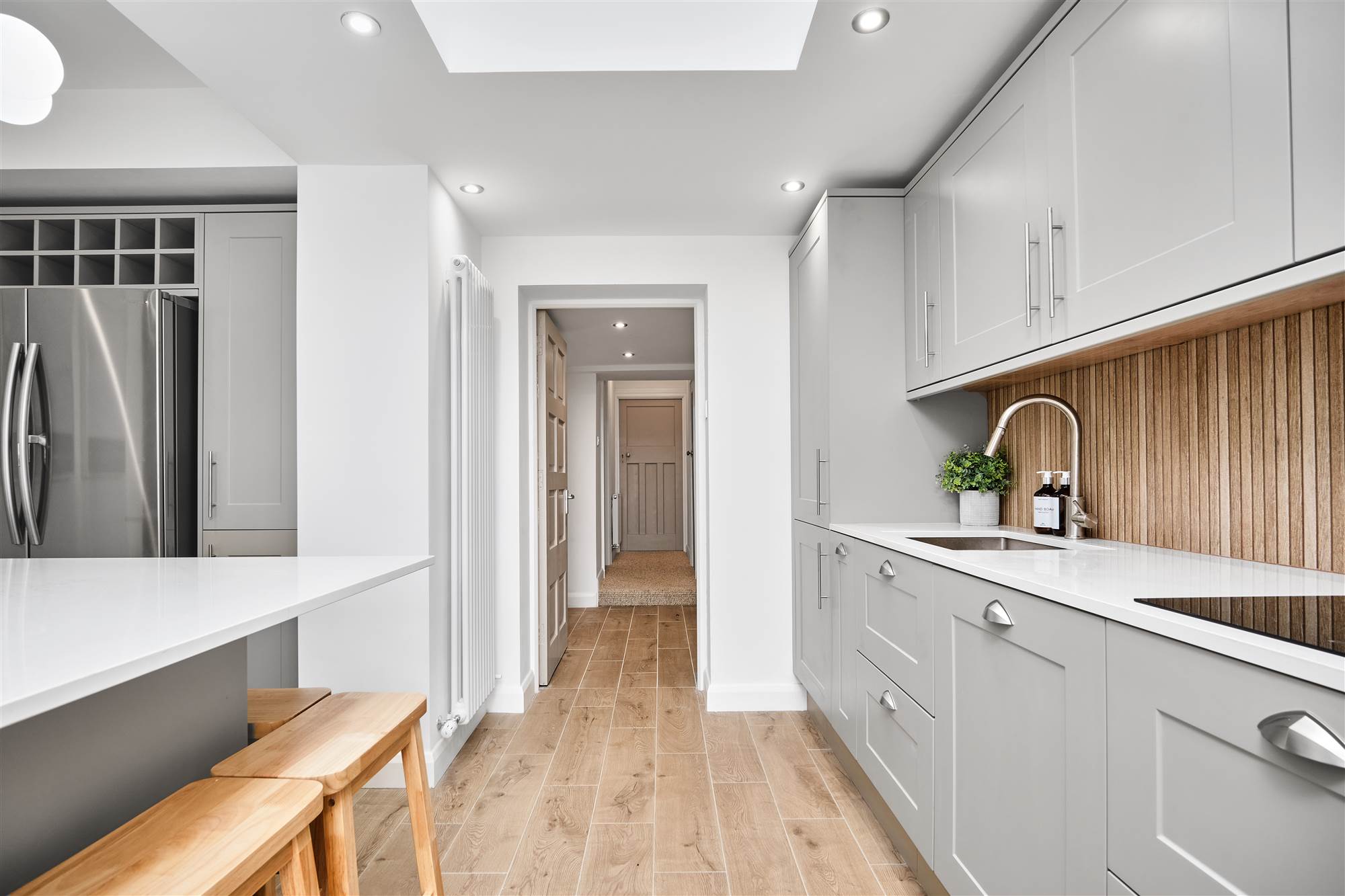 With bowl and half stainless steel sink unit set in granite worktops, high and low level units with wood effect tiling between, integrated ceramic hob, extractor fan above, double eye level oven, microwave, plumbed for American style fridge freezer, larder cupboards, saucepan drawers with rack, matching granite island with seating for multiple diners, recessed lighting, skylight and tiled floor.