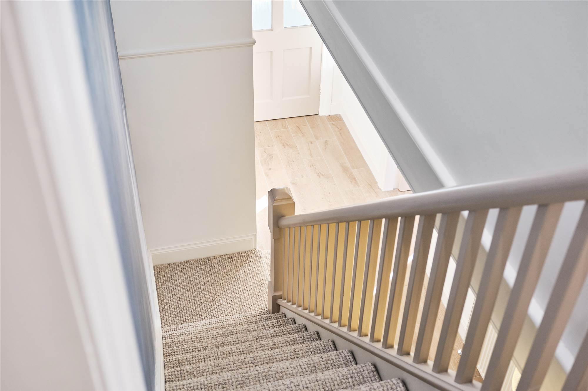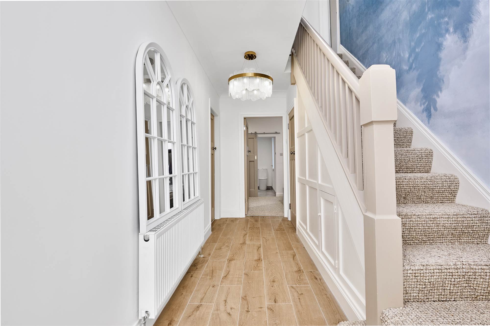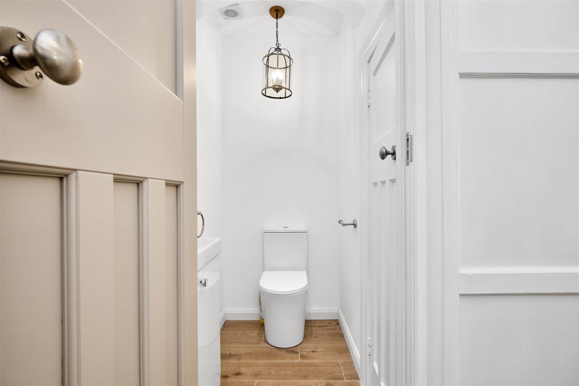 With wash hand basin with tiled splashback, storage below, understairs storage, extractor fan and tiled floor.