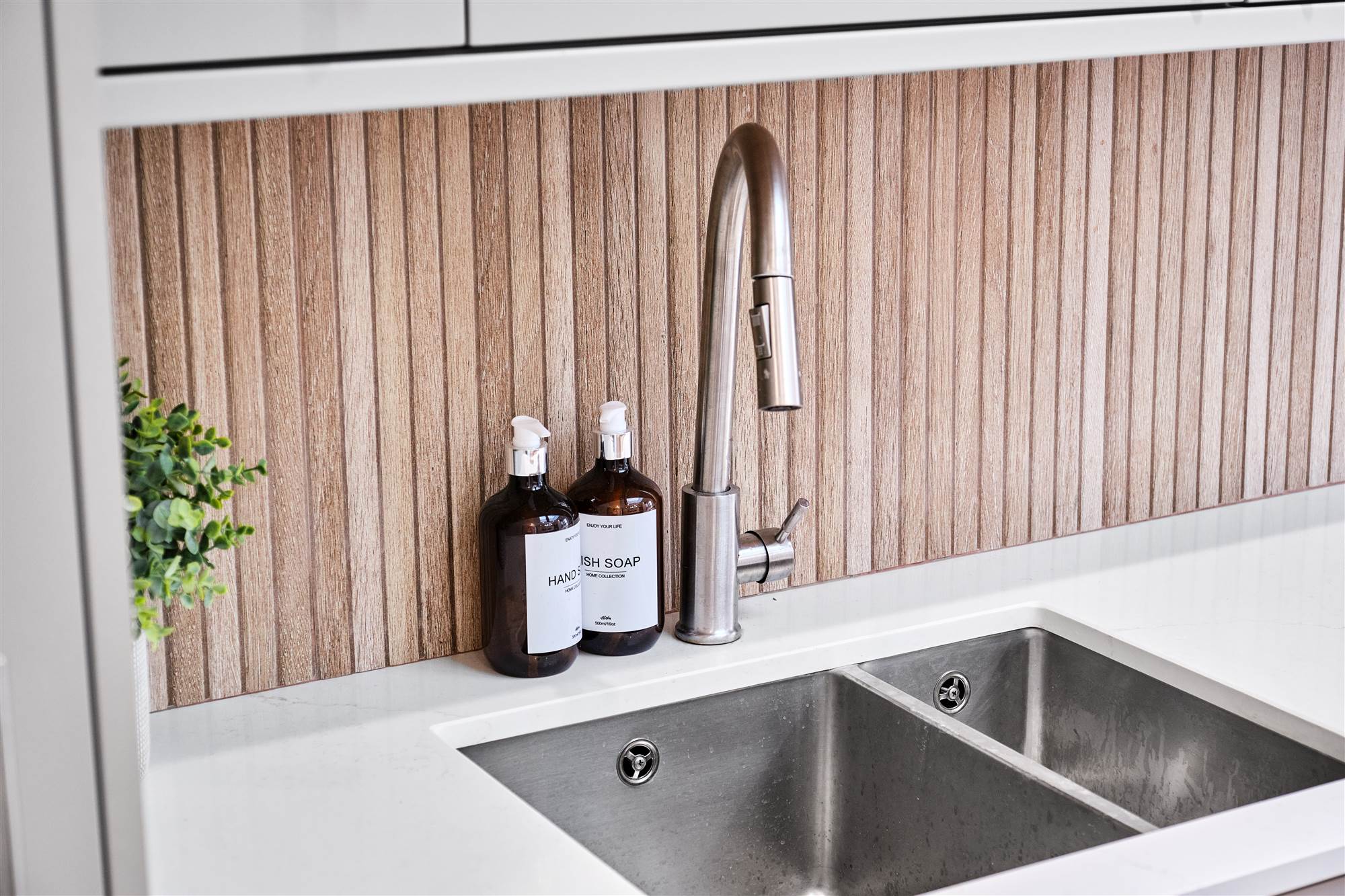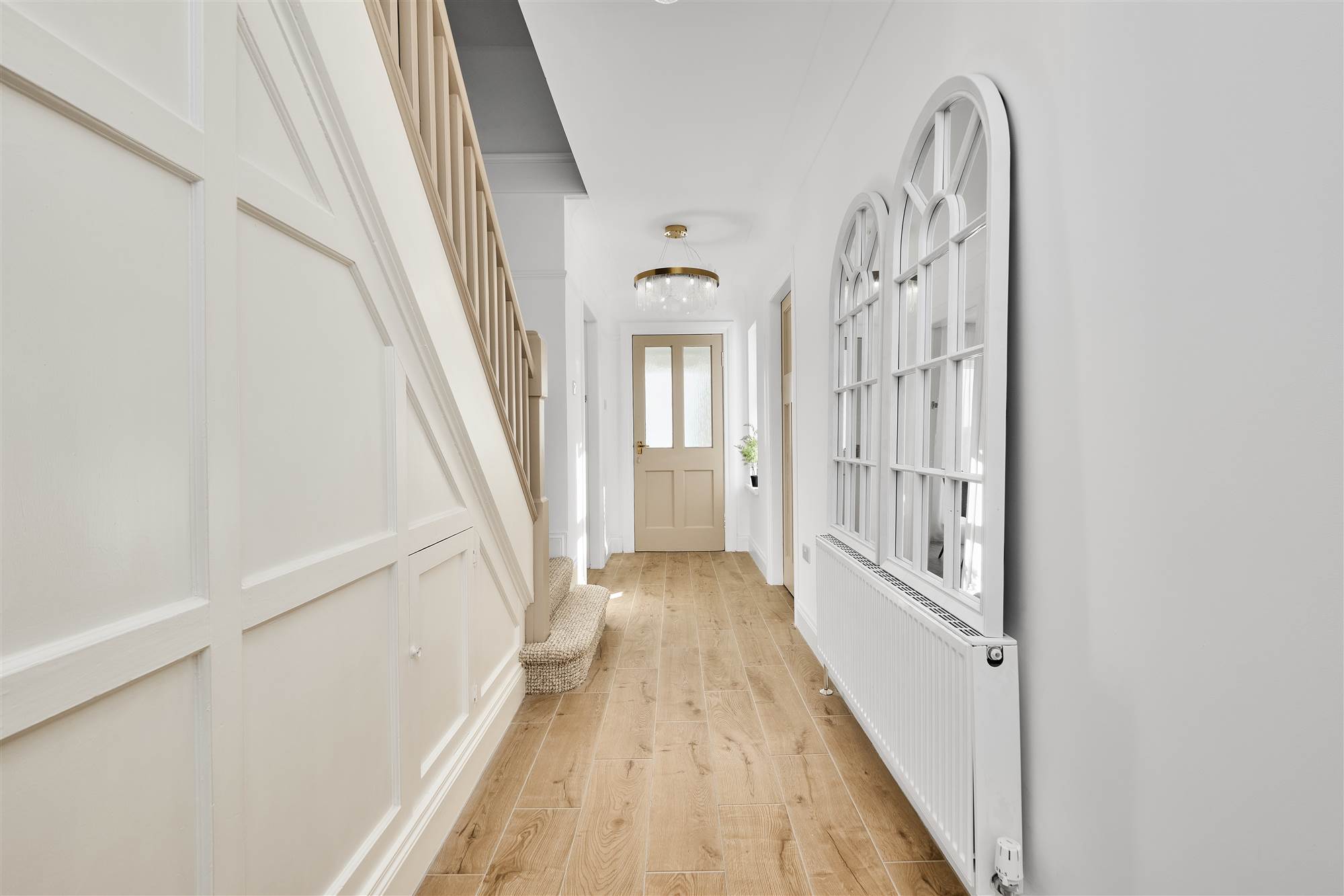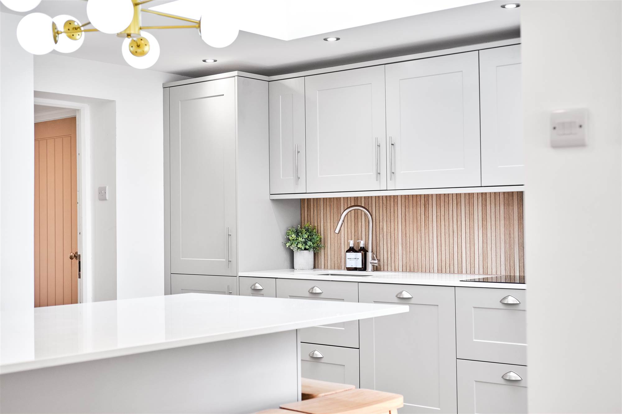 With wash hand basin with tiled splashback, storage below, understairs storage, extractor fan and tiled floor.