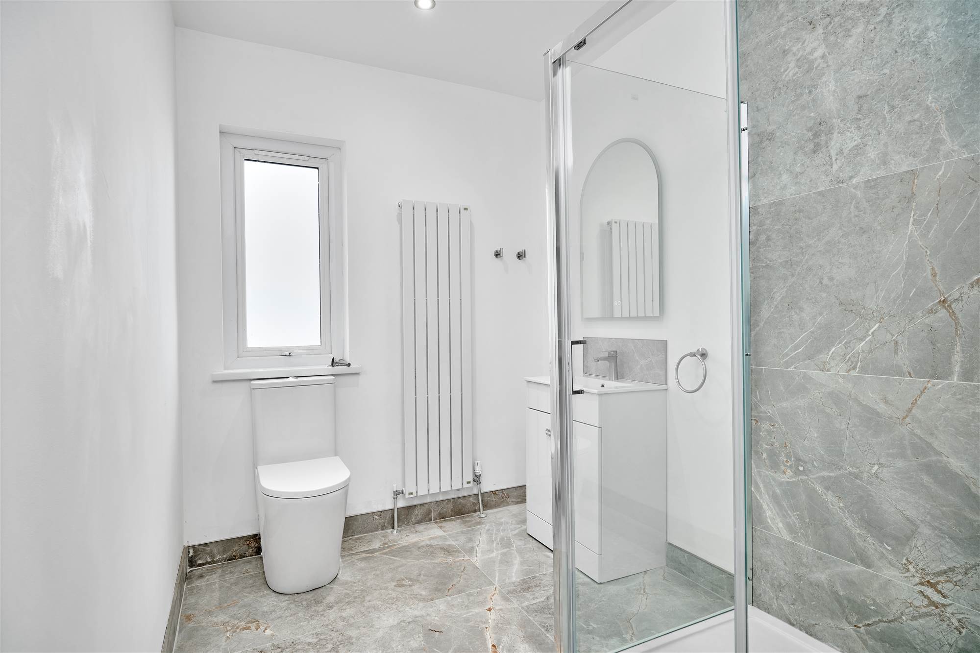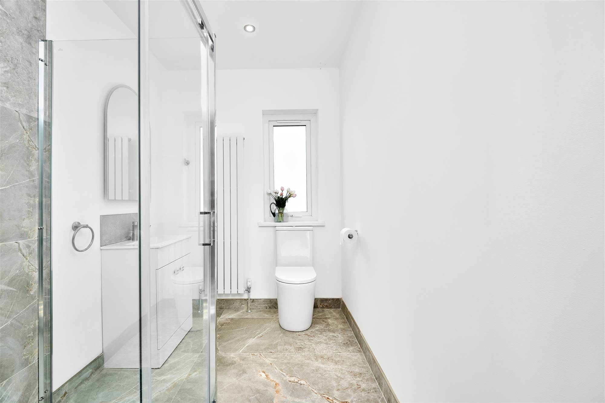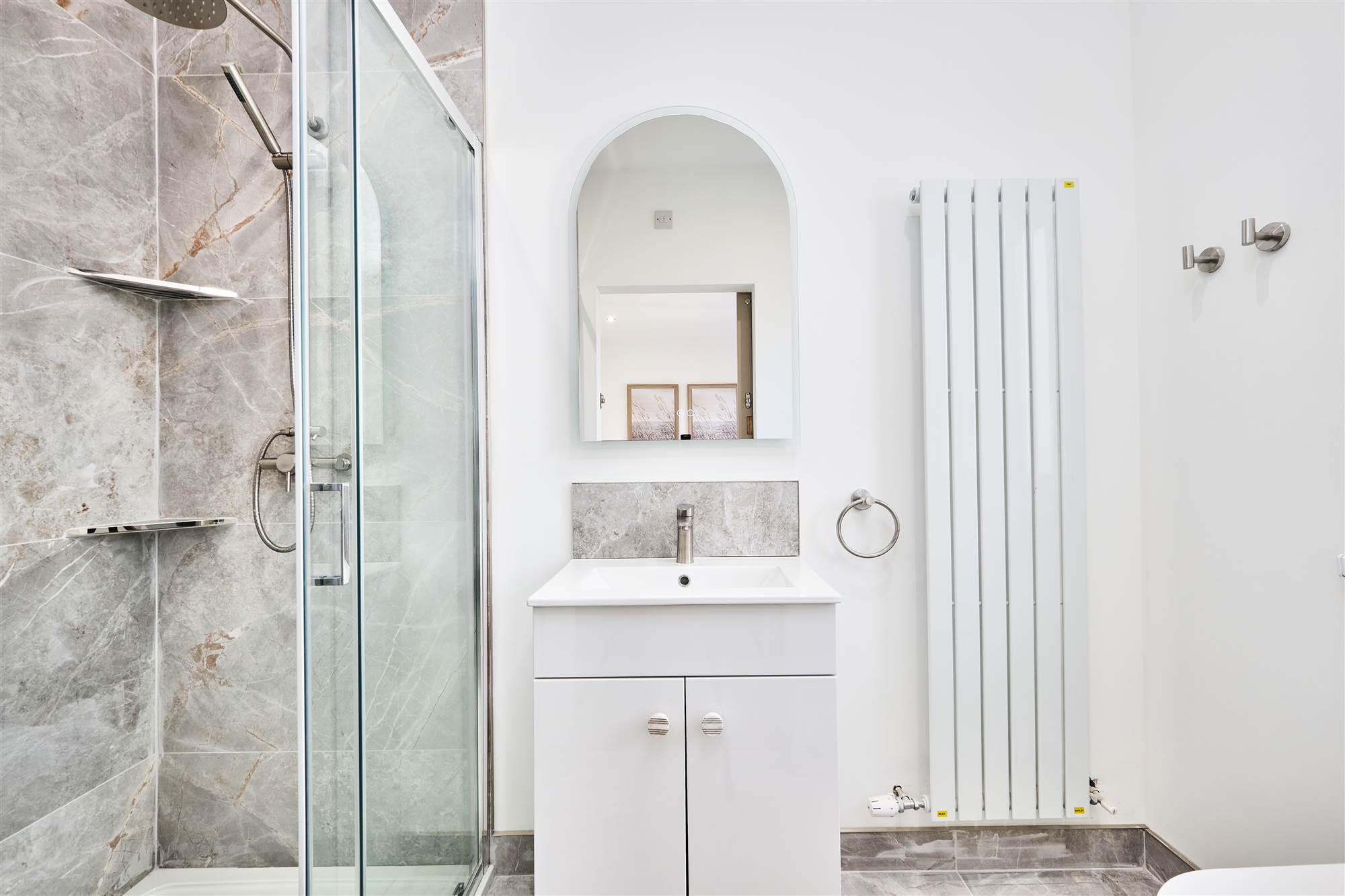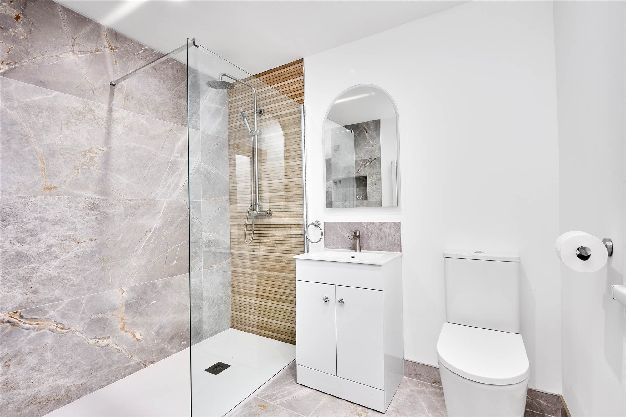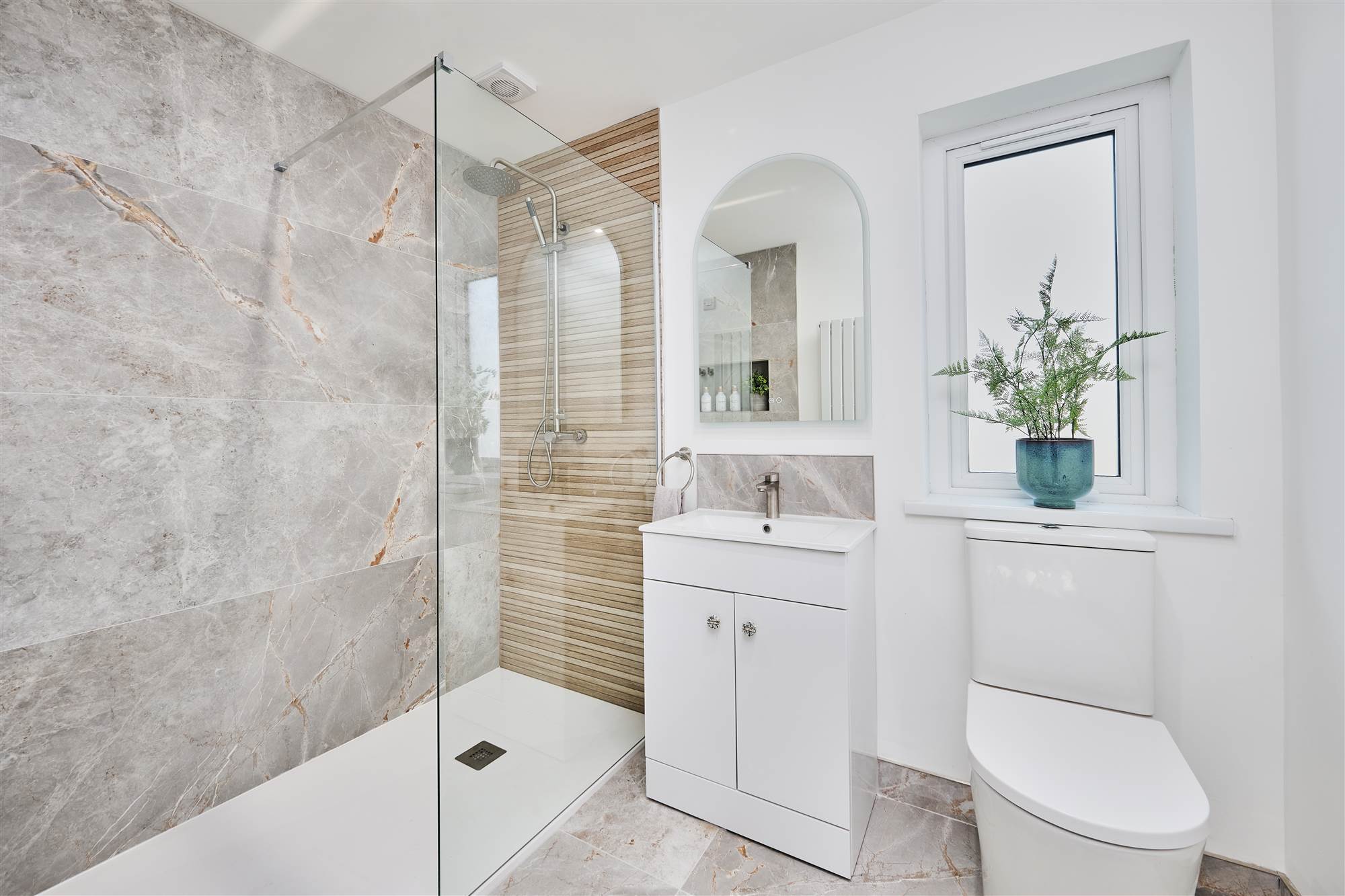 With w.c., wash hand basin with tiled splashback, storage below, fully tiled walk in shower cubicle with mains rainfall shower head, additional telephone hand shower, extractor fan, recessed lighting and tiled floor.