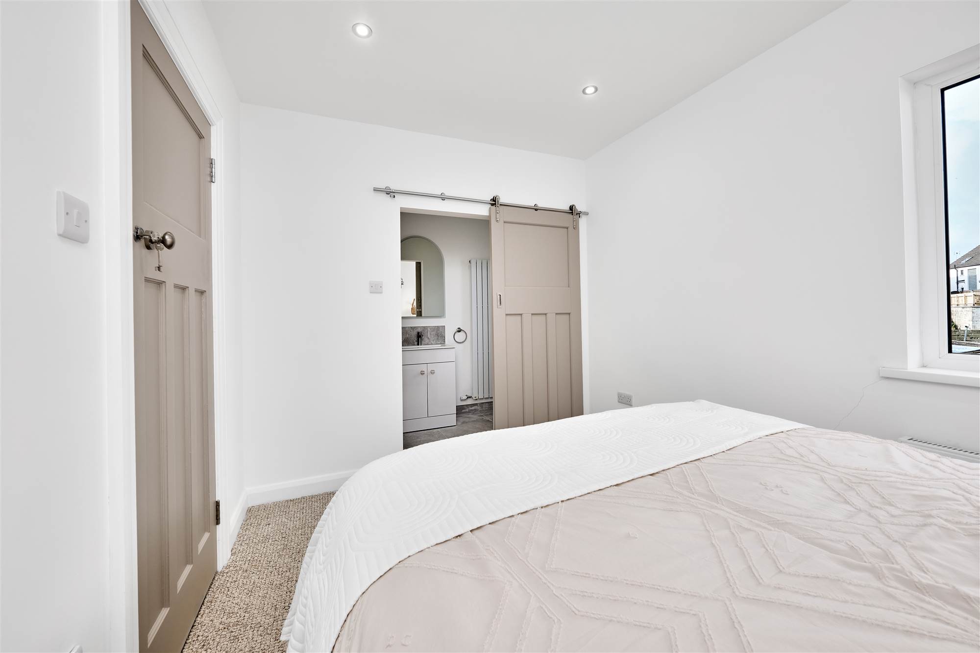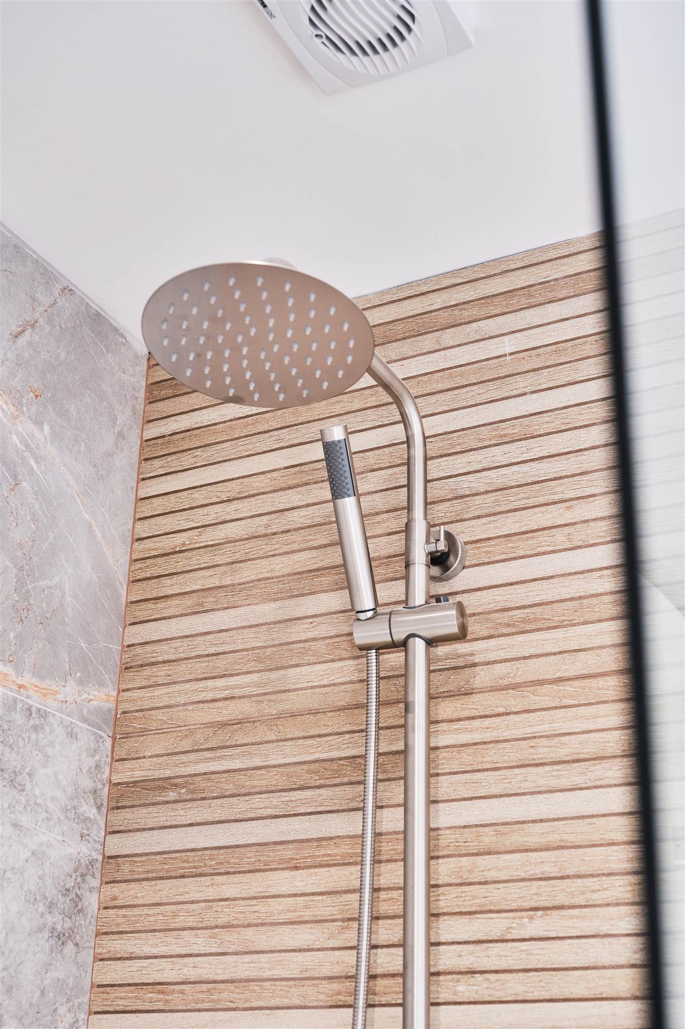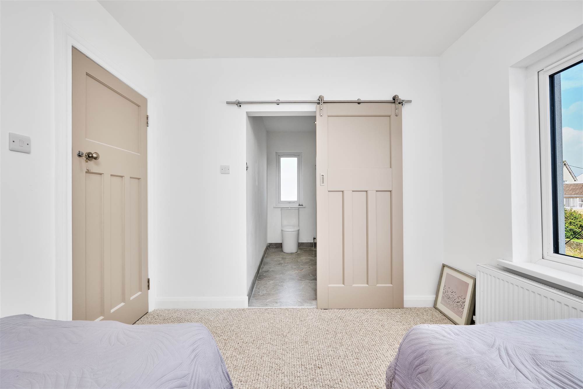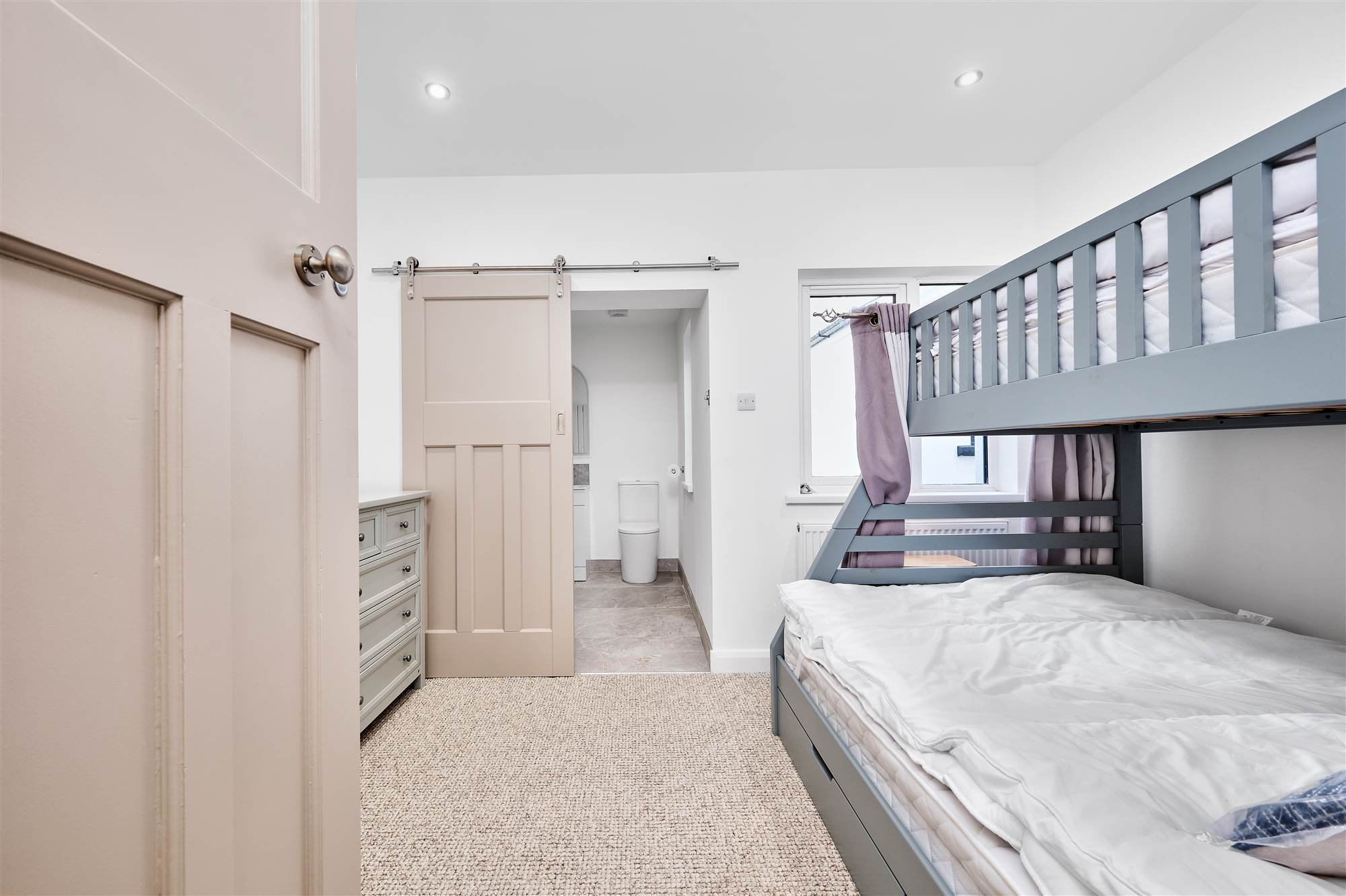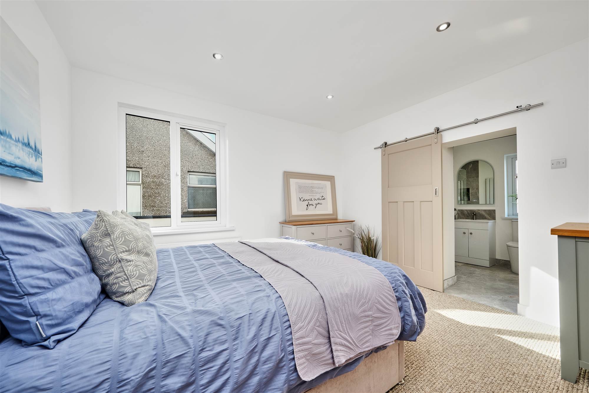 With w.c., wash hand basin with tiled splashback, storage below, fully tiled walk in shower cubicle with mains rainfall shower head, additional telephone hand shower, extractor fan, recessed lighting and tiled floor.