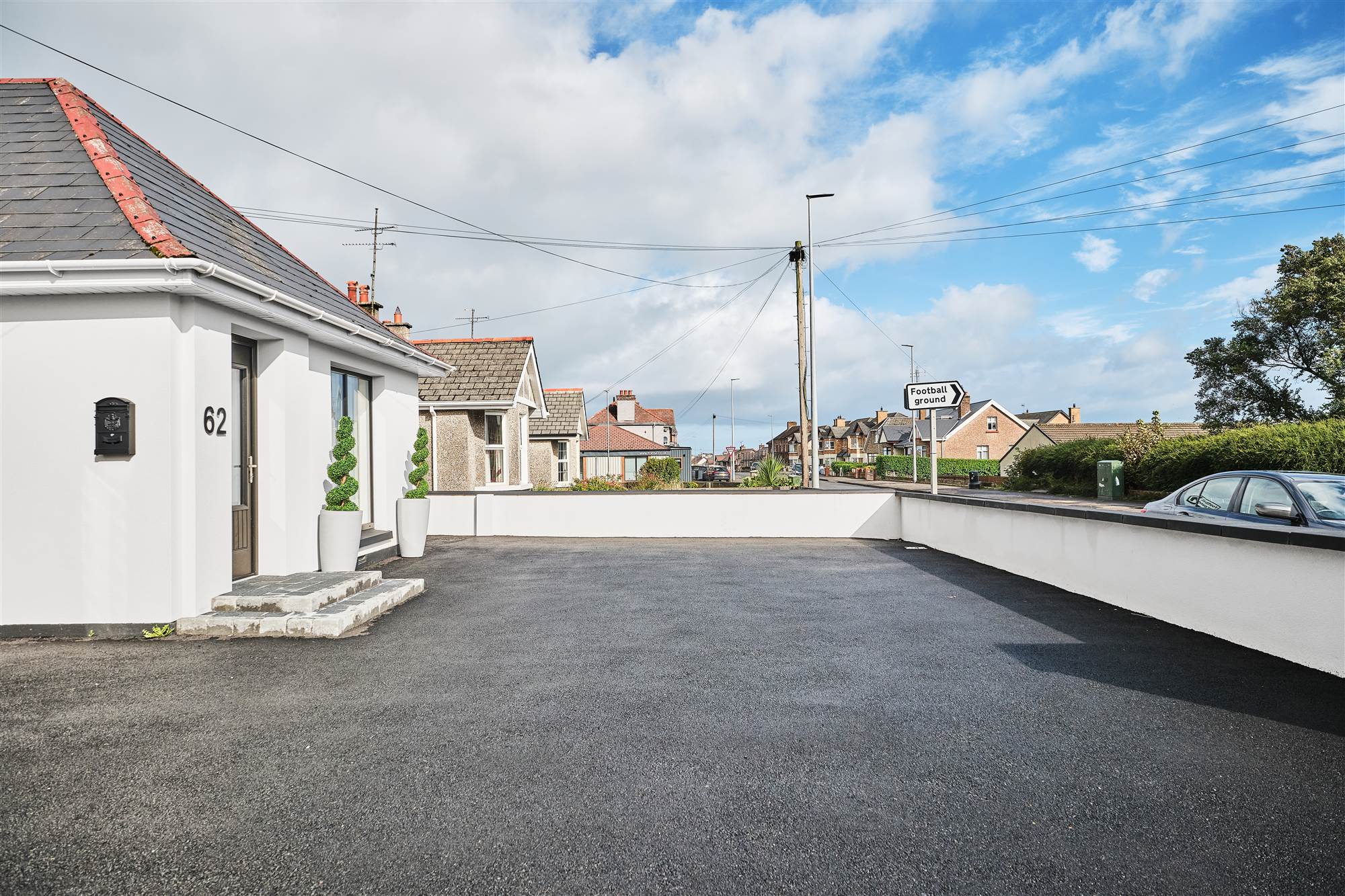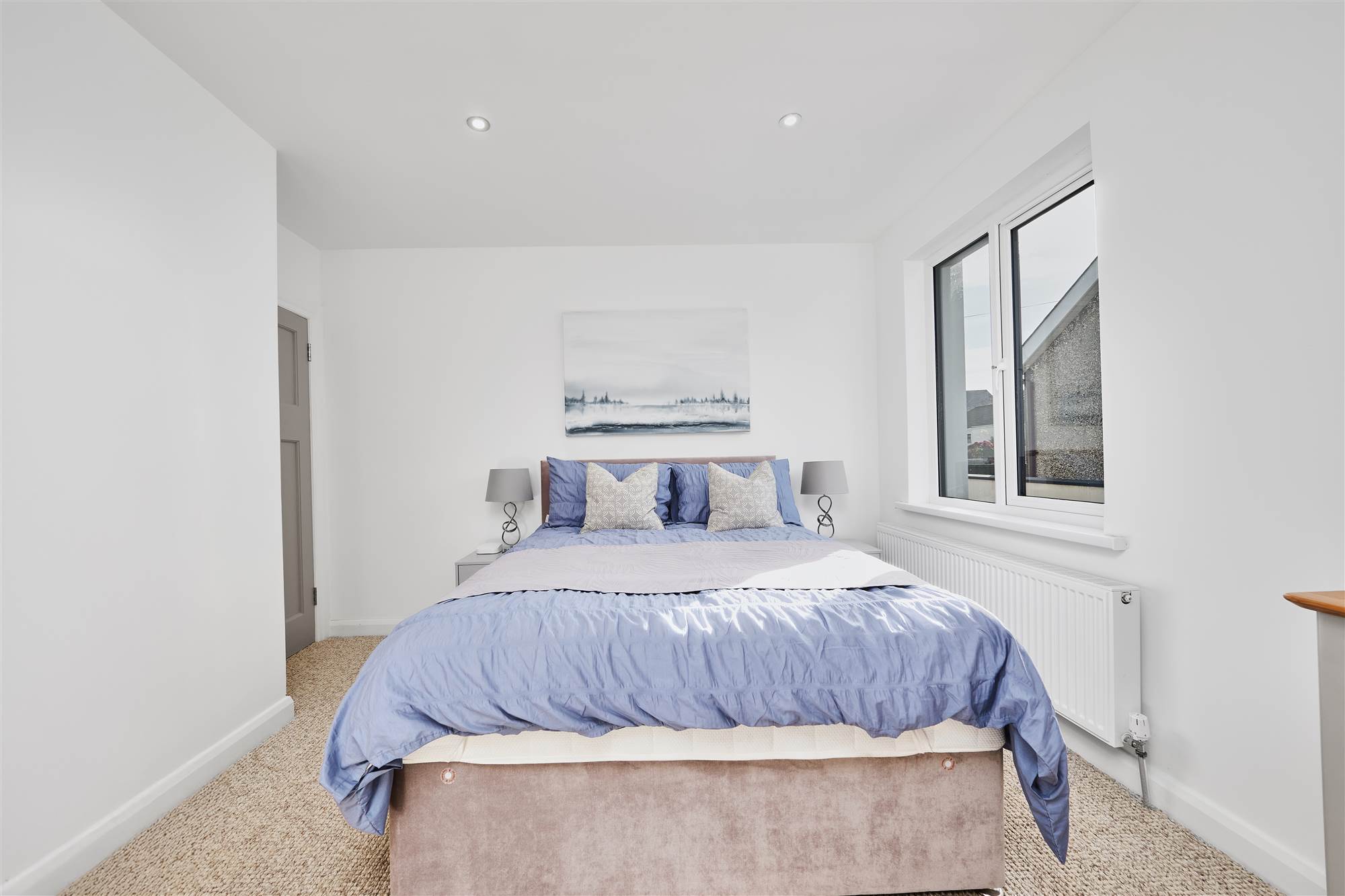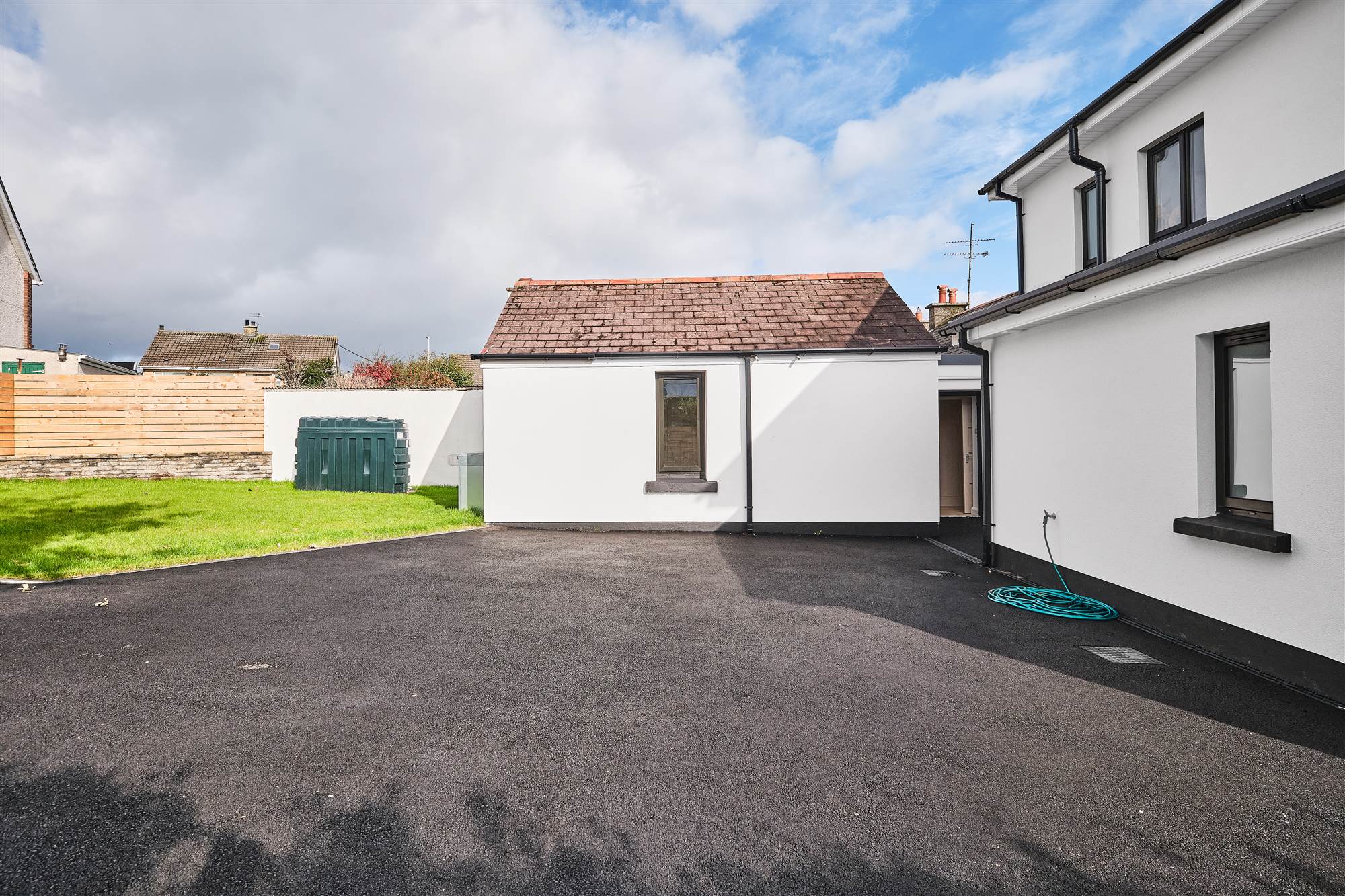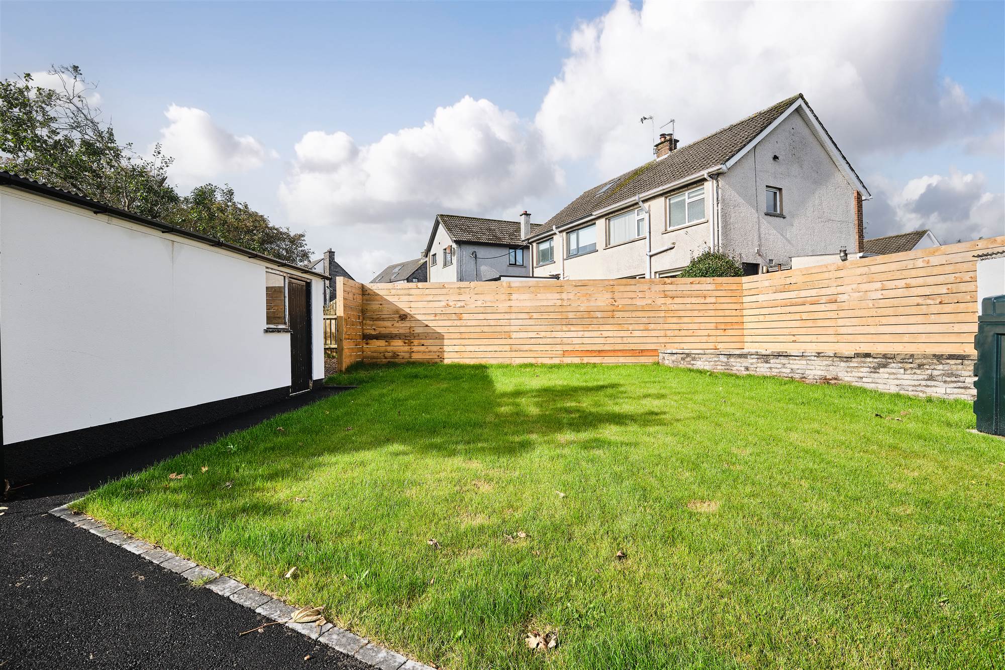 Tarmac driveway leading to detached garage 20"1 x 13"6 approx. with roller door, pedestrian door and strip lighting (no double glazing in garage). Garden to rear is laid in lawn with elevated and screened flower bed. Light to front and rear. Tap to rear and boiler. Area to front is fully tarmac with paved steps to front door.