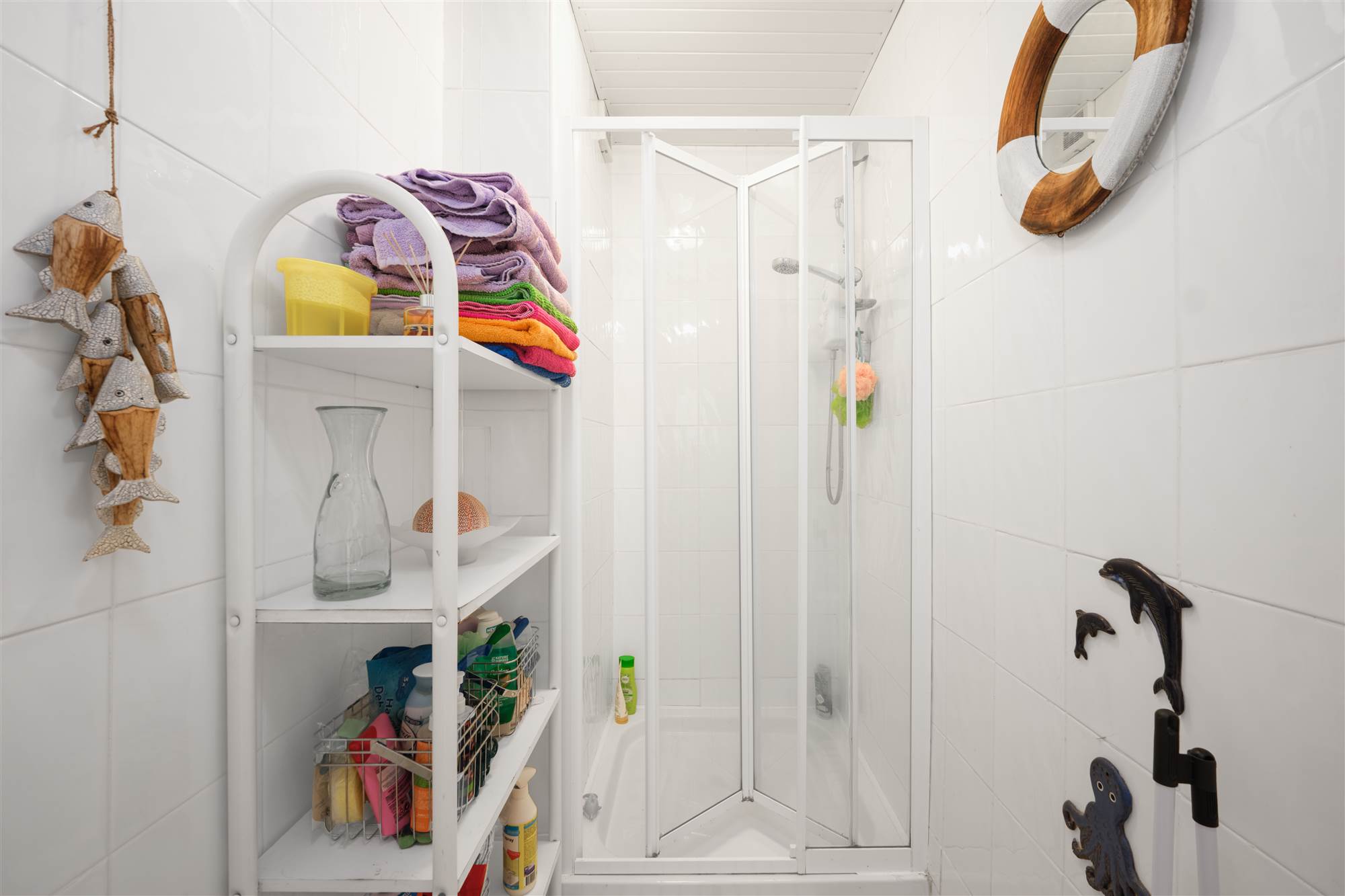 With white suite comprising fully tiled walk in shower cubicle with electric shower, PVC sheeted ceiling, extractor fan and tiled floor.