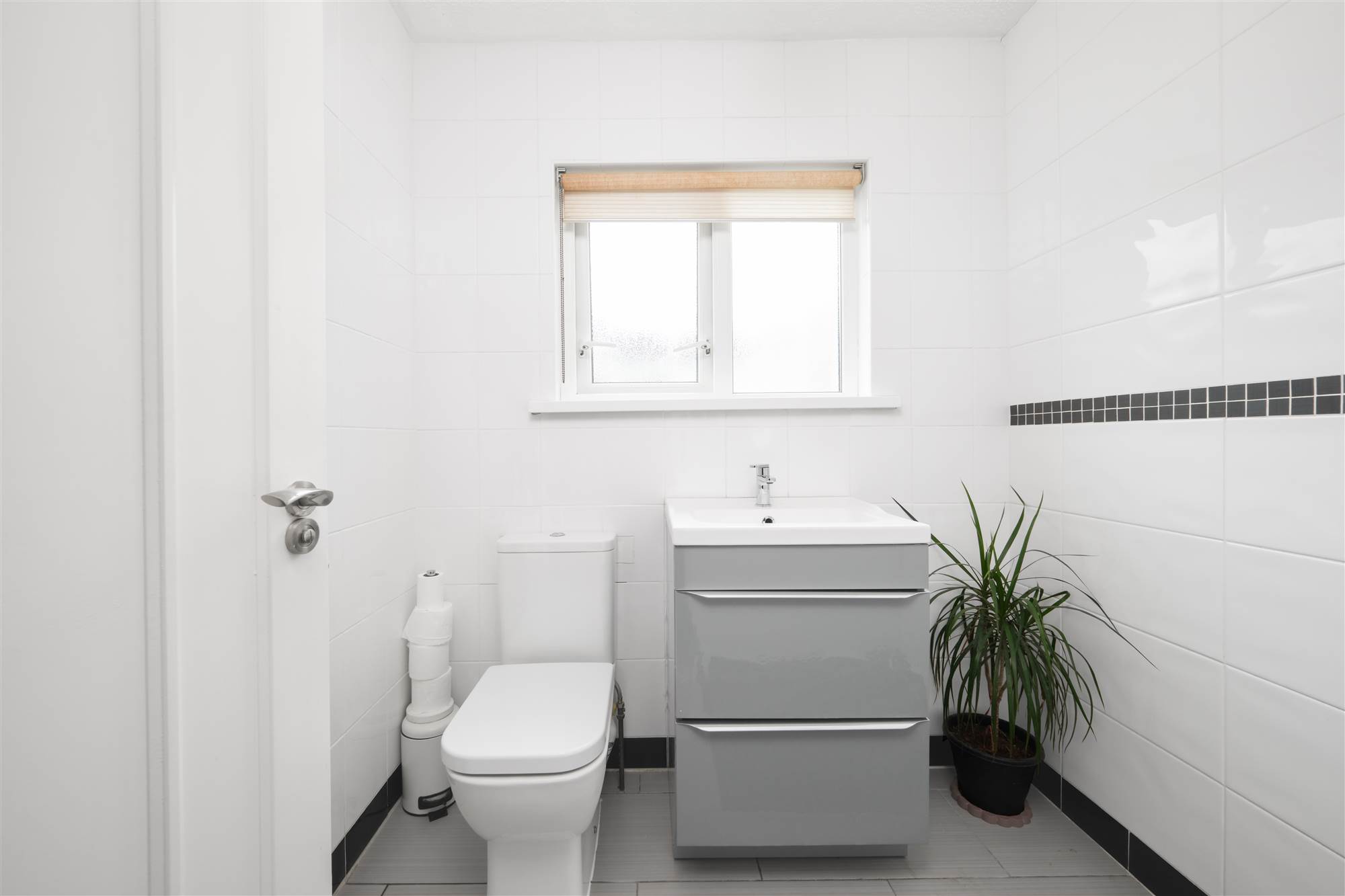 With white suite comprising w.c., wash hand basin with storage below, fully tiled surround electric shower in corner area, fully tiled walls and tiled floor.