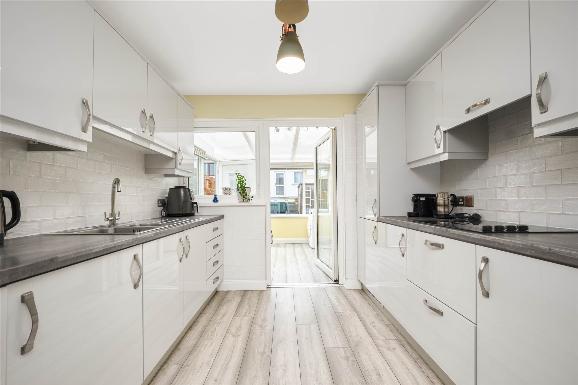 With bowl and half single drainer stainless steel sink unit, high and low level units with tiling between, integrated ceramic hob, extractor fan above, eye level oven, fridge freezer, saucepan drawers and laminate wood floor.