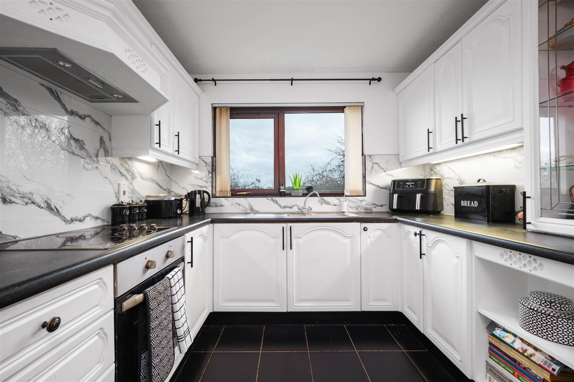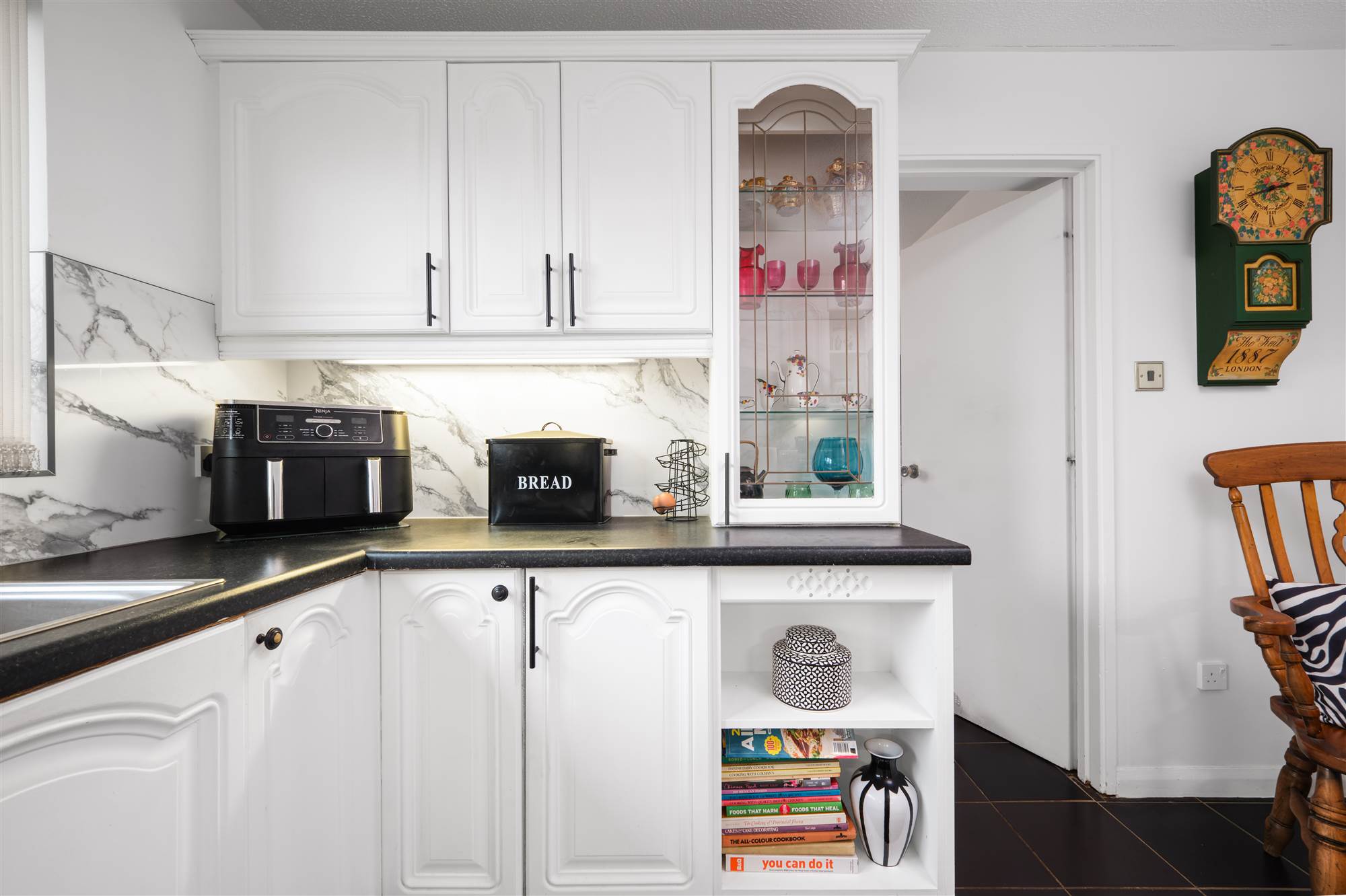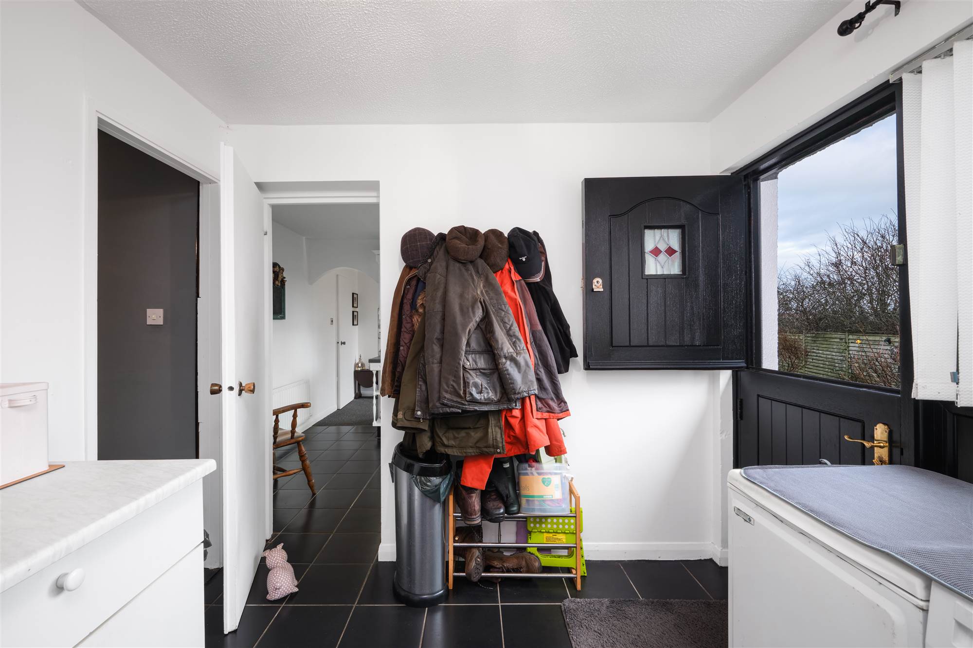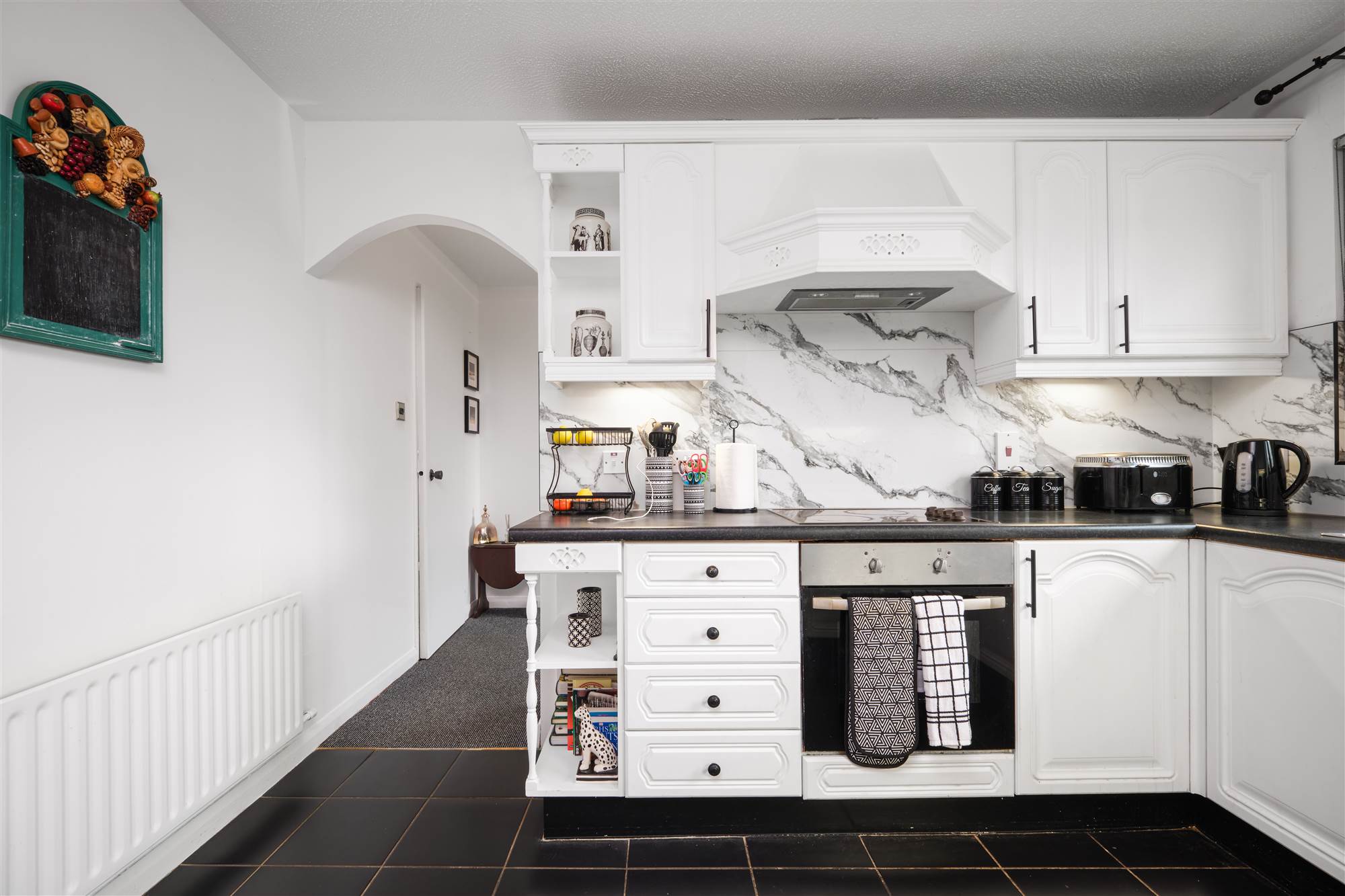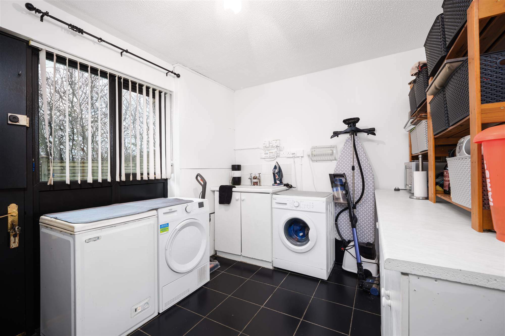 With sink unit with tiled splashback and storage below, low level units, plumbed for automatic washing machine, space for tumble dryer, space for fridge, space for fridge freezer, tiled floor, pedestrian door to rear garden and door to bedroom 4/office/study.