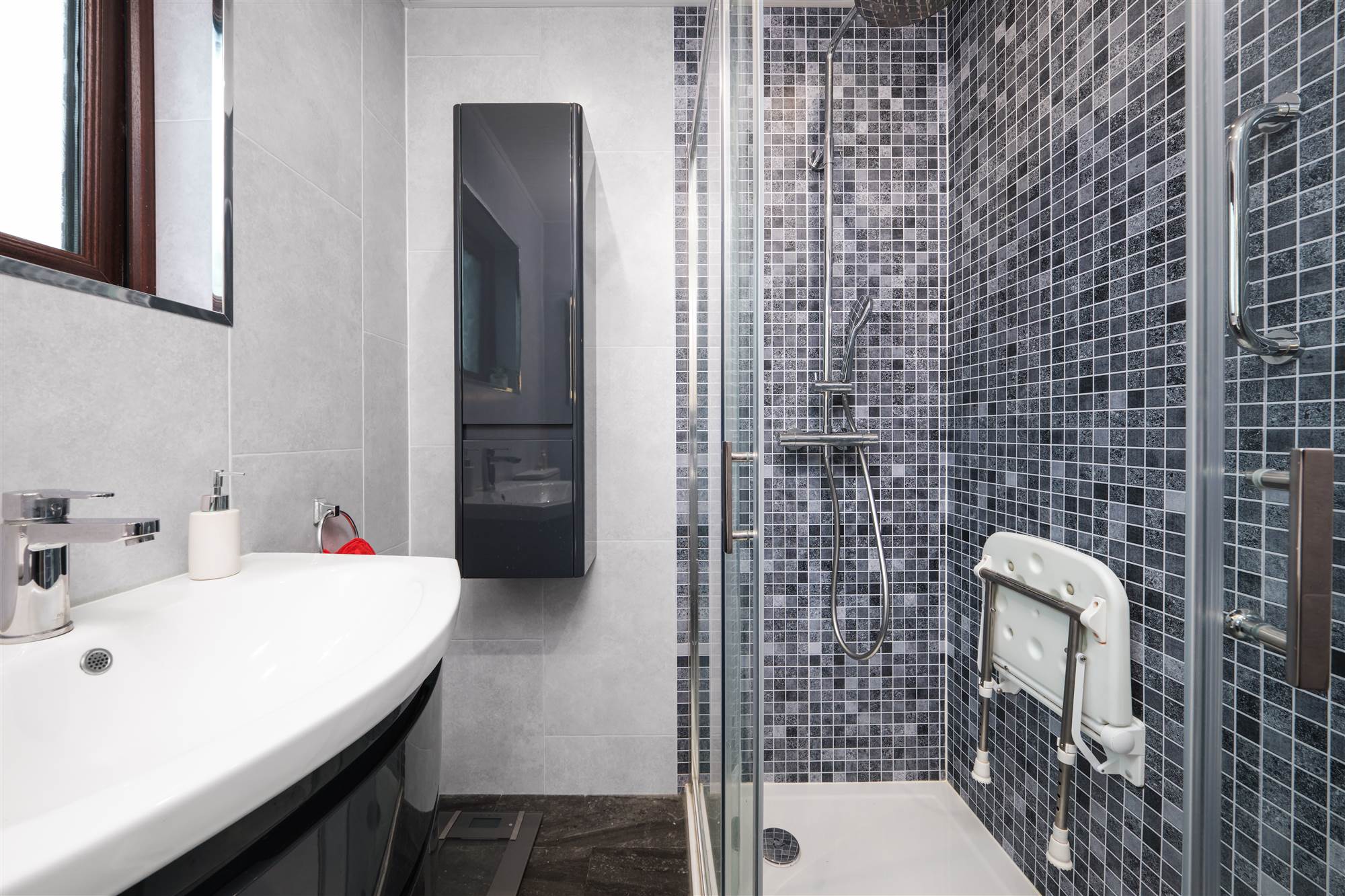 With white suite comprising w.c., wash hand basin set in vanity unit with storage below, matching cabinet storage, PVC clad walk in shower cubicle with mains rainfall shower head, additional telephone hand shower, PVC sheeted ceiling with recessed lighting, fully PVC sheeted walls and heated towel rail.